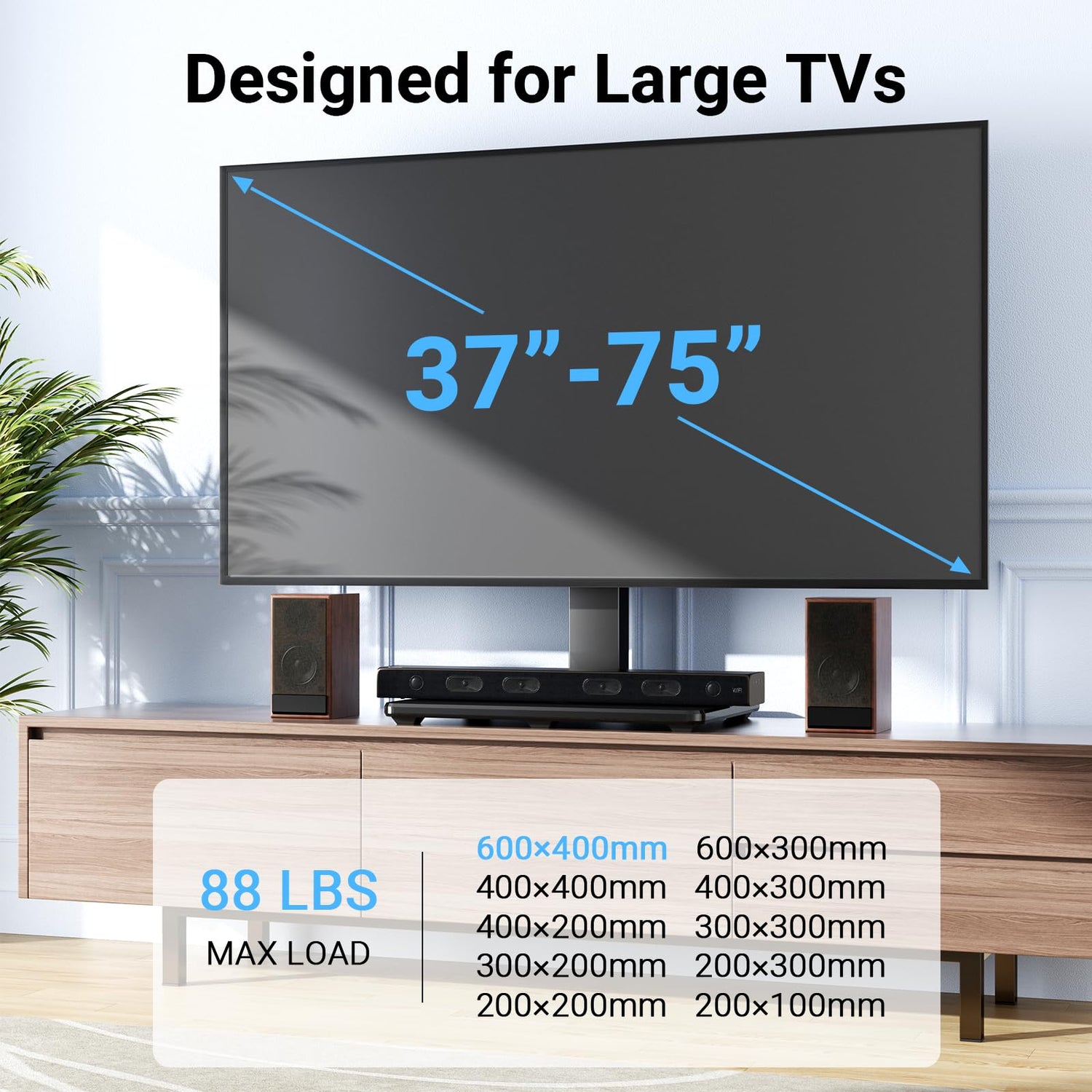 - 【Universal Design】Universal TV stand fits most 37"-75" TVs(including 37'' 39'' 40'' 42'' 43'' 49'' 50'' 55'' 60'' 65'' 70'' 75"), VESA(mounting holes pattern): 200X100-600X400mm(8"x4"-24"x16"). Our table top TV stand is compatible with Sony/Samsung/Vizio/Insignia/TCL/LG TVs in bedroom,school,office and so on. Solid steel pillar provides stable support for your TV, well made and good looking.