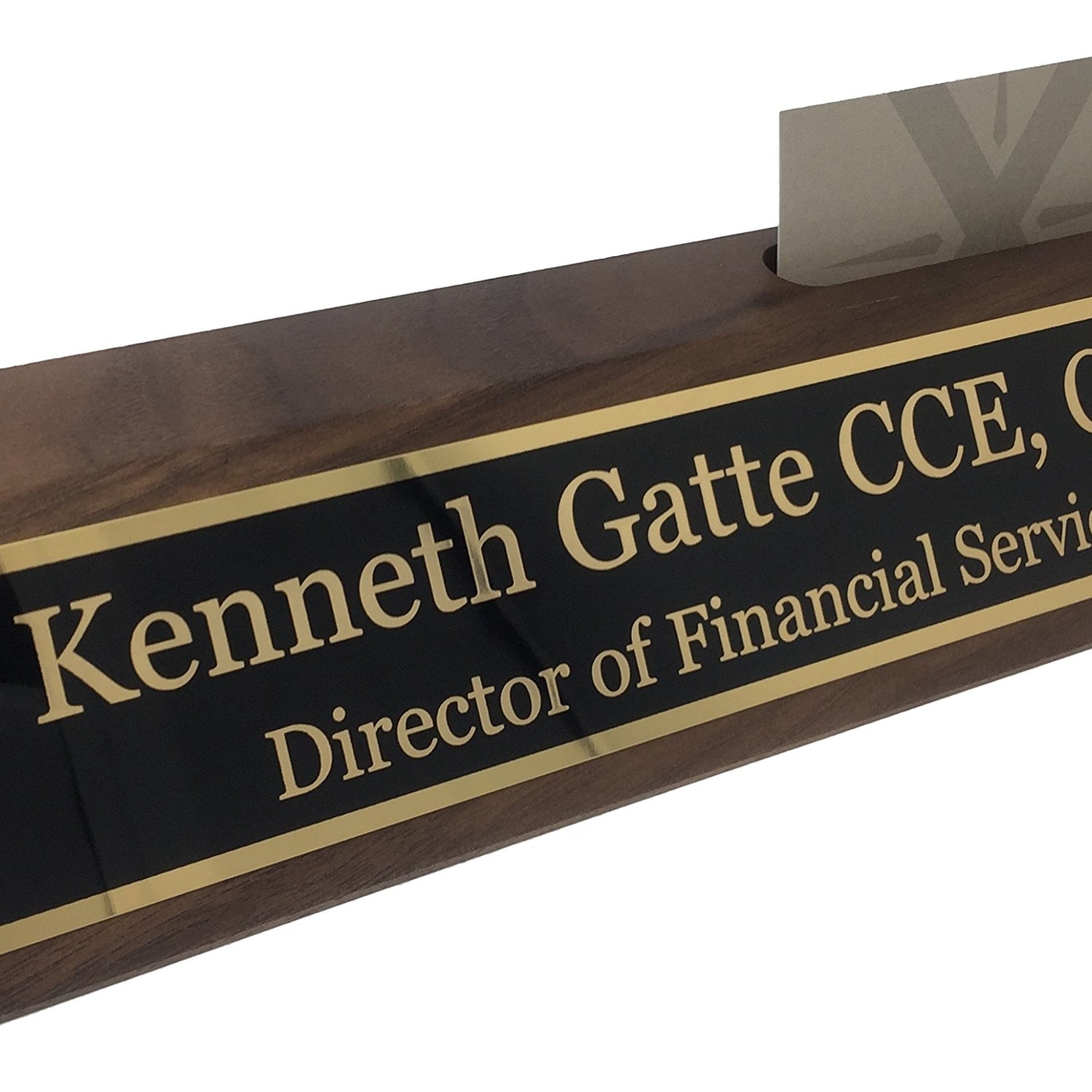 - Extreme Quality - This 10" desk block is made from walnut and features a built in slot to hold your business cards. Included is your personalized custom metal name plate.