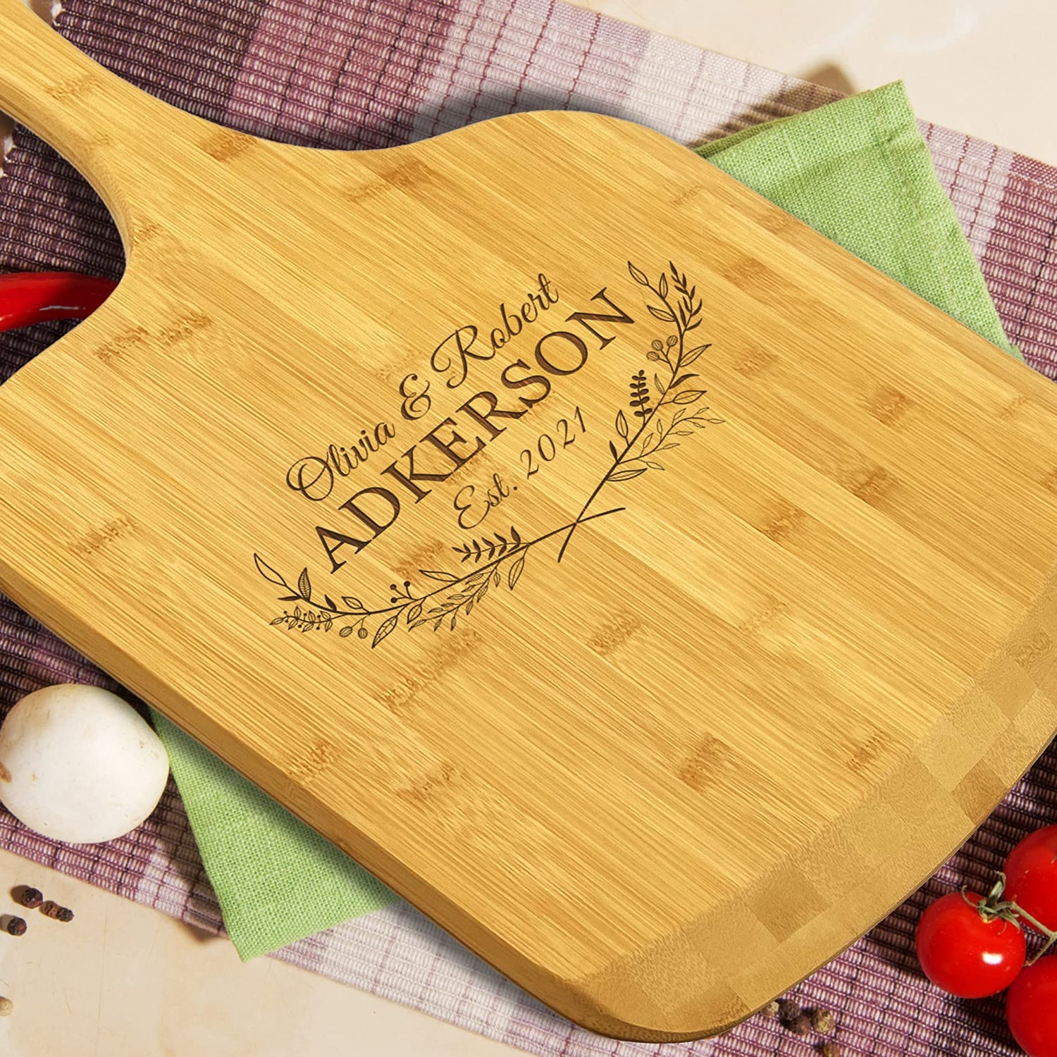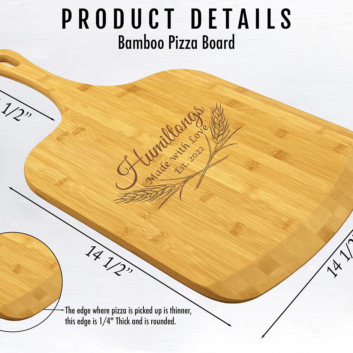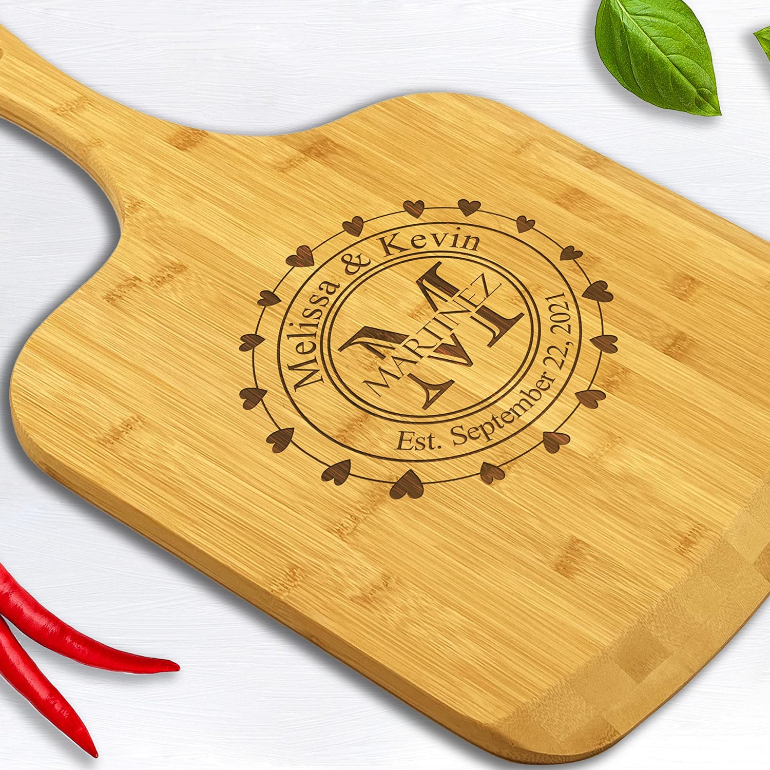 - PERFECT GIFT: A perfect accent to any kitchen, you will love this personalized Bamboo Pizza Board. Laser Engraved Pizza Board perfect gift for a family, couple, friends, or maybe that special someone in your life. Surprise others with a unique Wedding, Anniversary, Birthday, Pizza party or Housewarming gift. Show your appreciation with a one of a kind party favor for your bridesmaids or groomsmen.