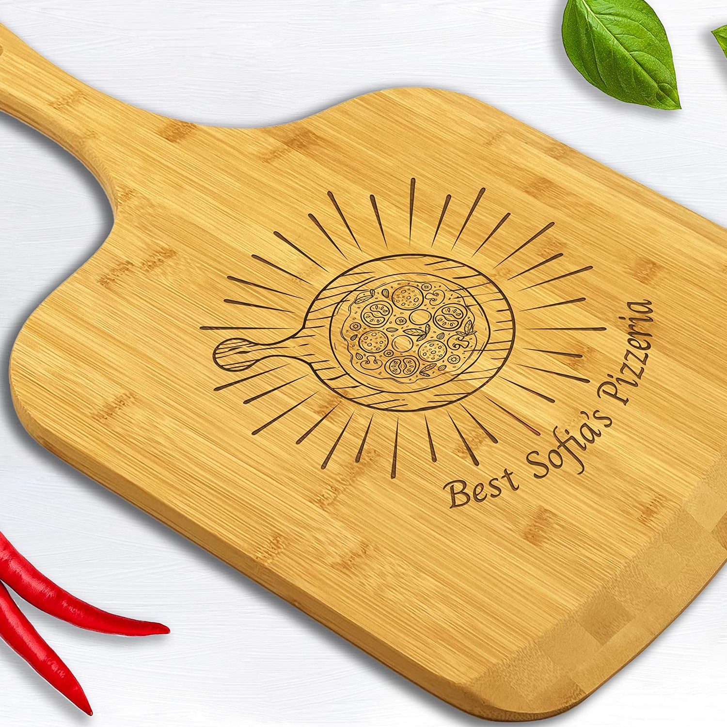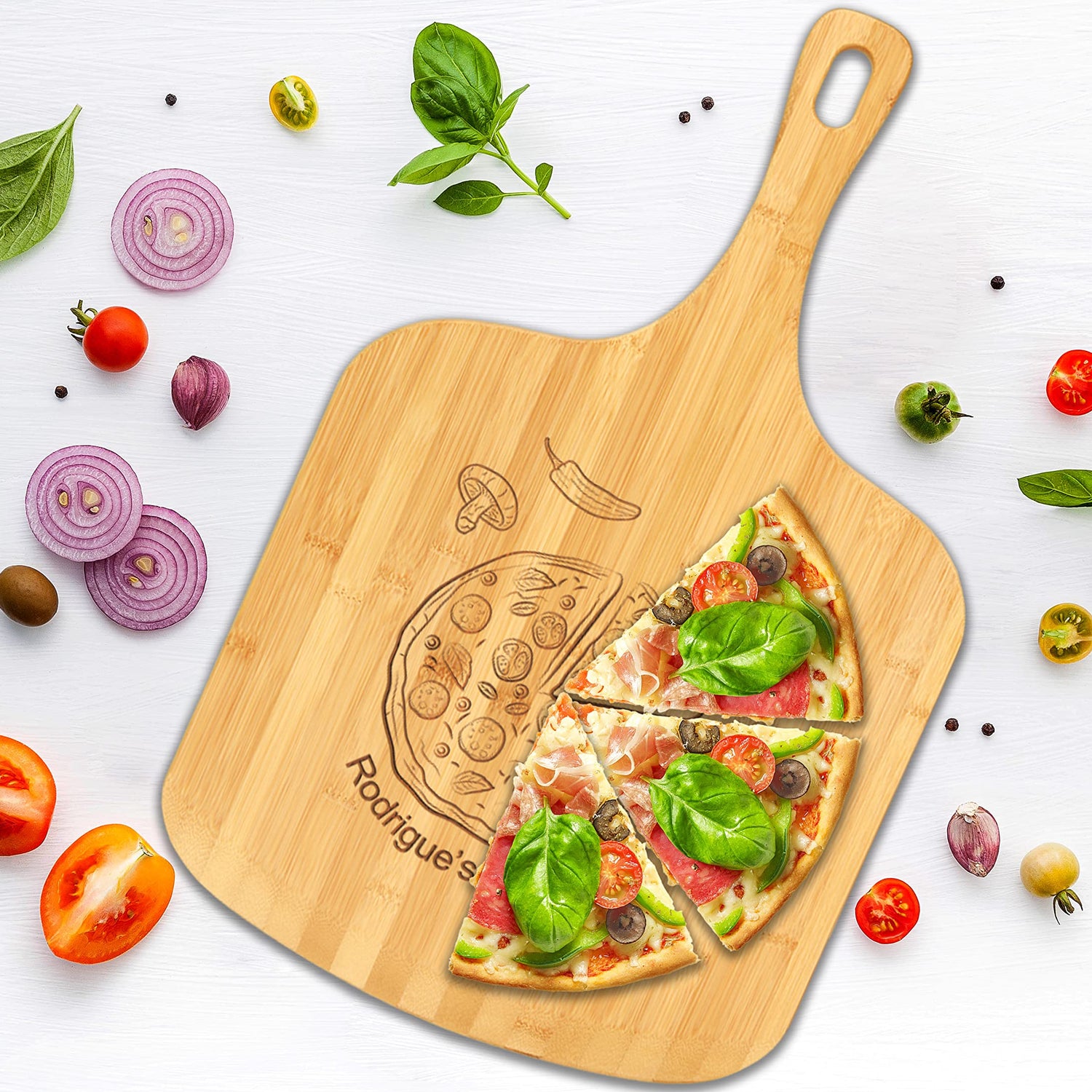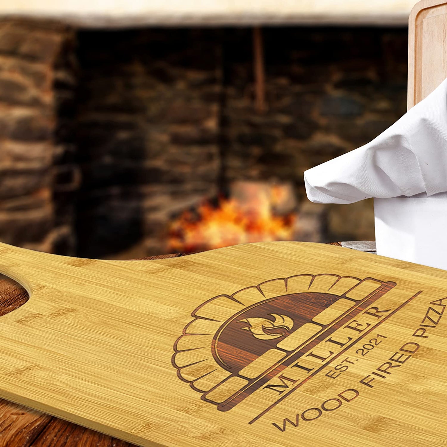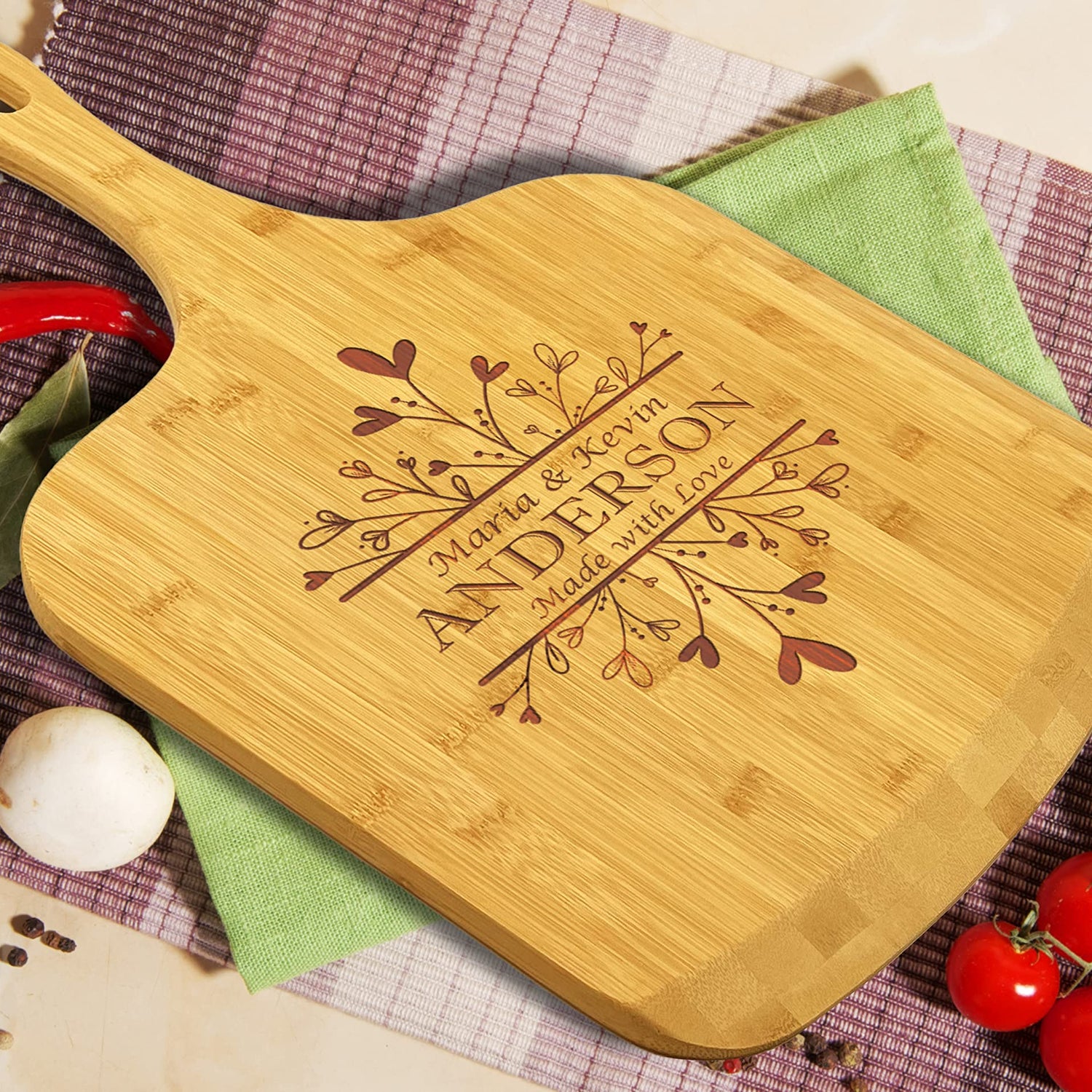 - PERFECT GIFT: A perfect accent to any kitchen, you will love this personalized Bamboo Pizza Board. Laser Engraved Pizza Board perfect gift for a family, couple, friends, or maybe that special someone in your life. Surprise others with a unique Wedding, Anniversary, Birthday, Pizza party or Housewarming gift. Show your appreciation with a one of a kind party favor for your bridesmaids or groomsmen.