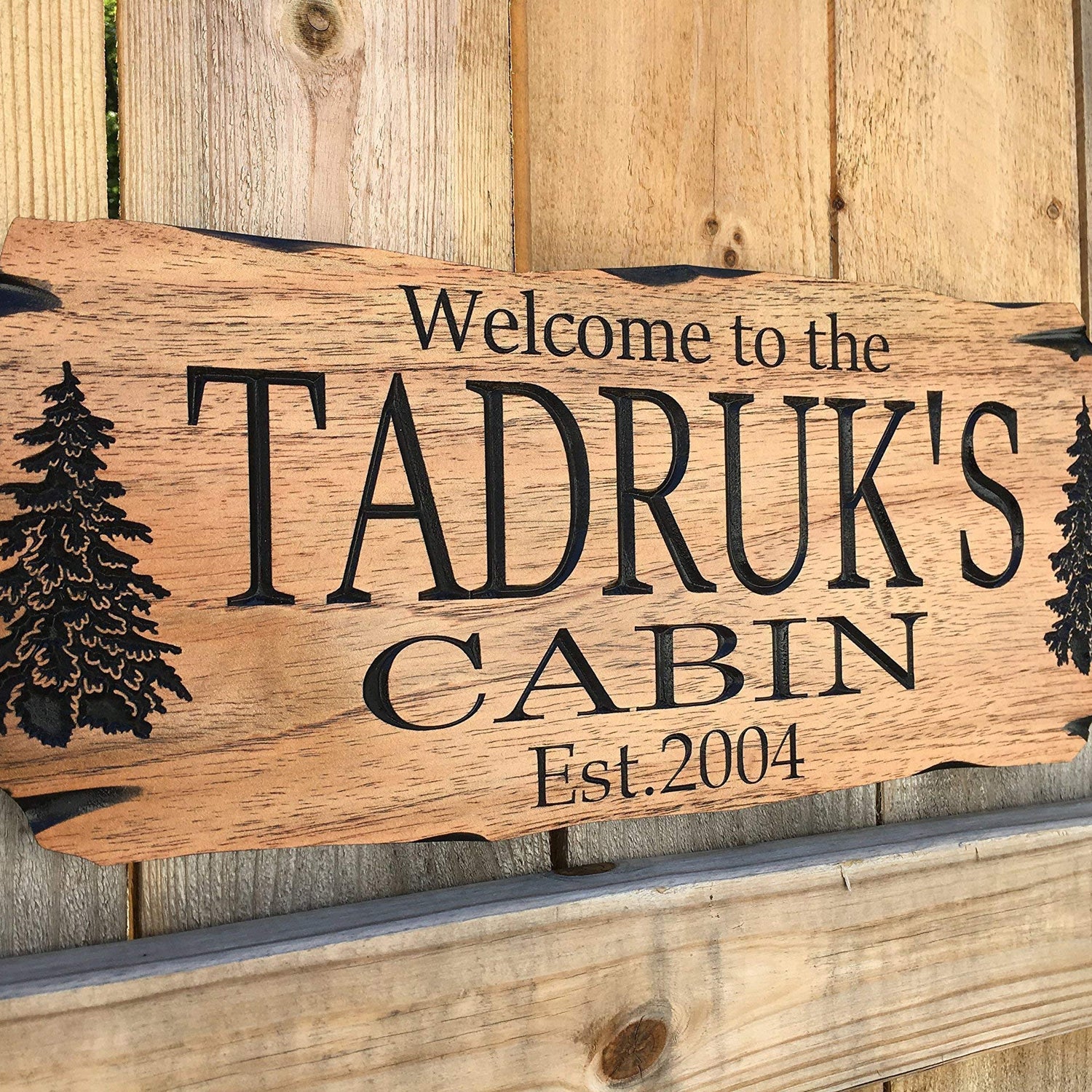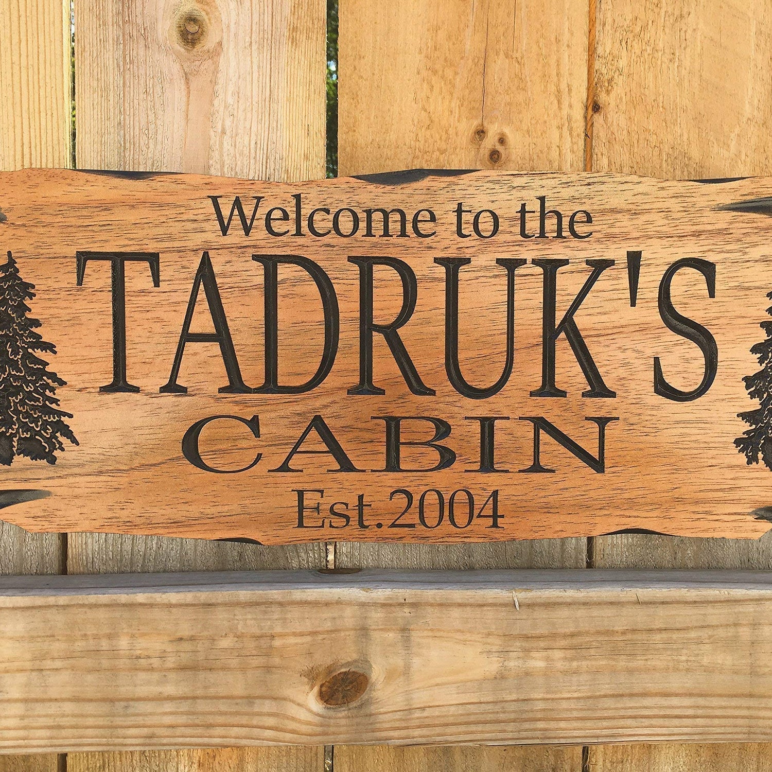 Details: We are the originator of this style sign! Made by BENCHMARK SIGNS AND GIFTS! These Personalized wooden carved cabin signs are sure to impress your guests! Featuring your established date and detailed carved pine trees. These custom rustic signs boast beautify carved black text and images along with a crystal clear protective finish that highlights the grain in the natural solid Mahogany. The sizes are approximate. Each sign is one of a kind and carved from solid Mahogany (not cheap white pine), sealed and suitable for outdoor display. Providing partial protection from the direct elements (such as hanging under an overhang) will prolong your signs finish. All signs come with mounting screws for easy installation. All of the text is carved deep into the wood, not cheaply painted on using stencils or vinyl stickers. No text comes standard on the sign. We only carve what you enter in the customazarion section.