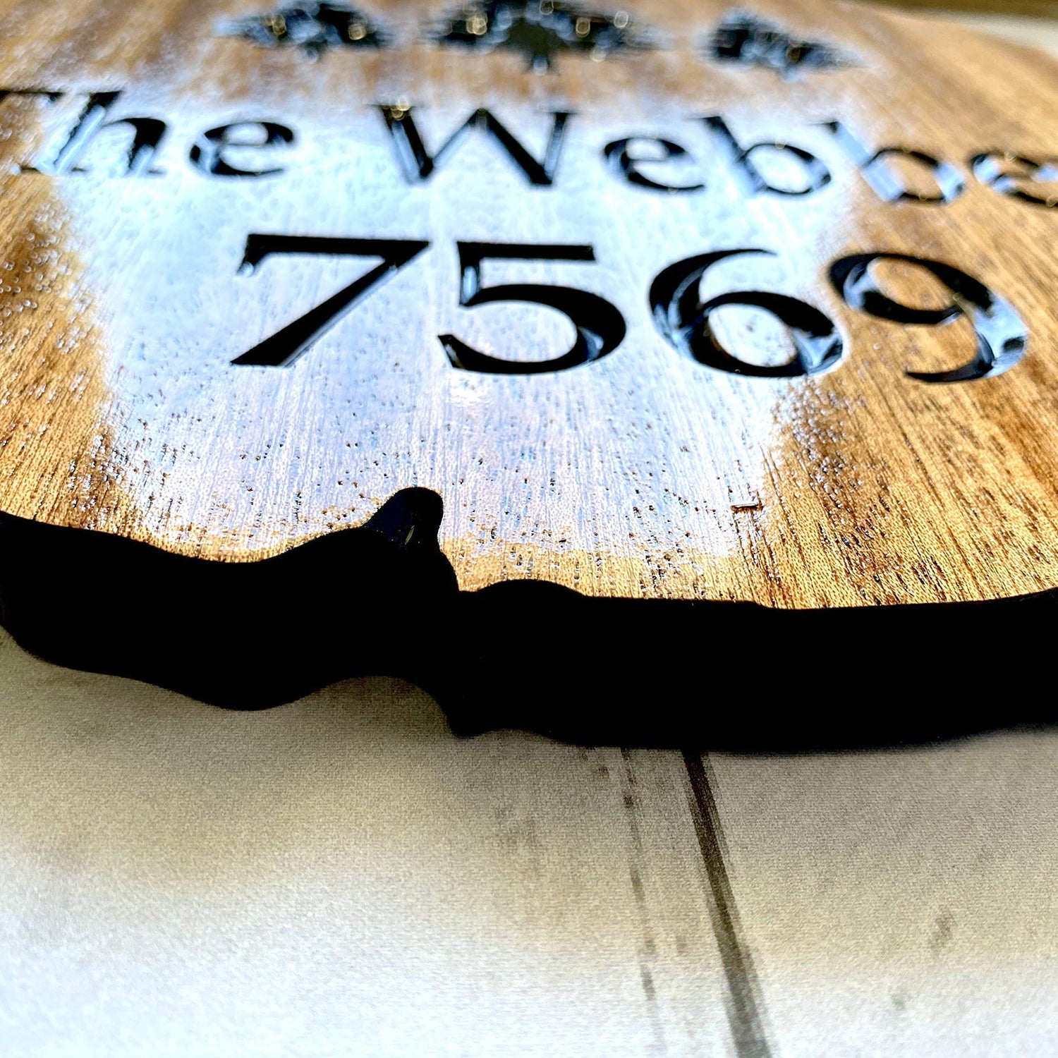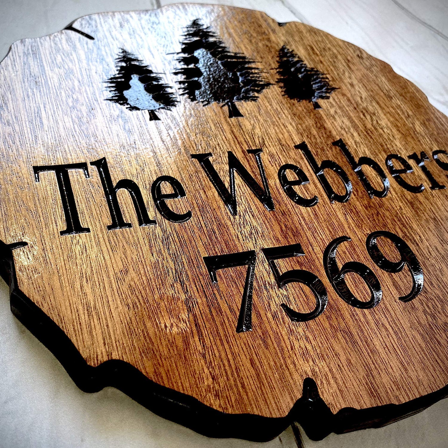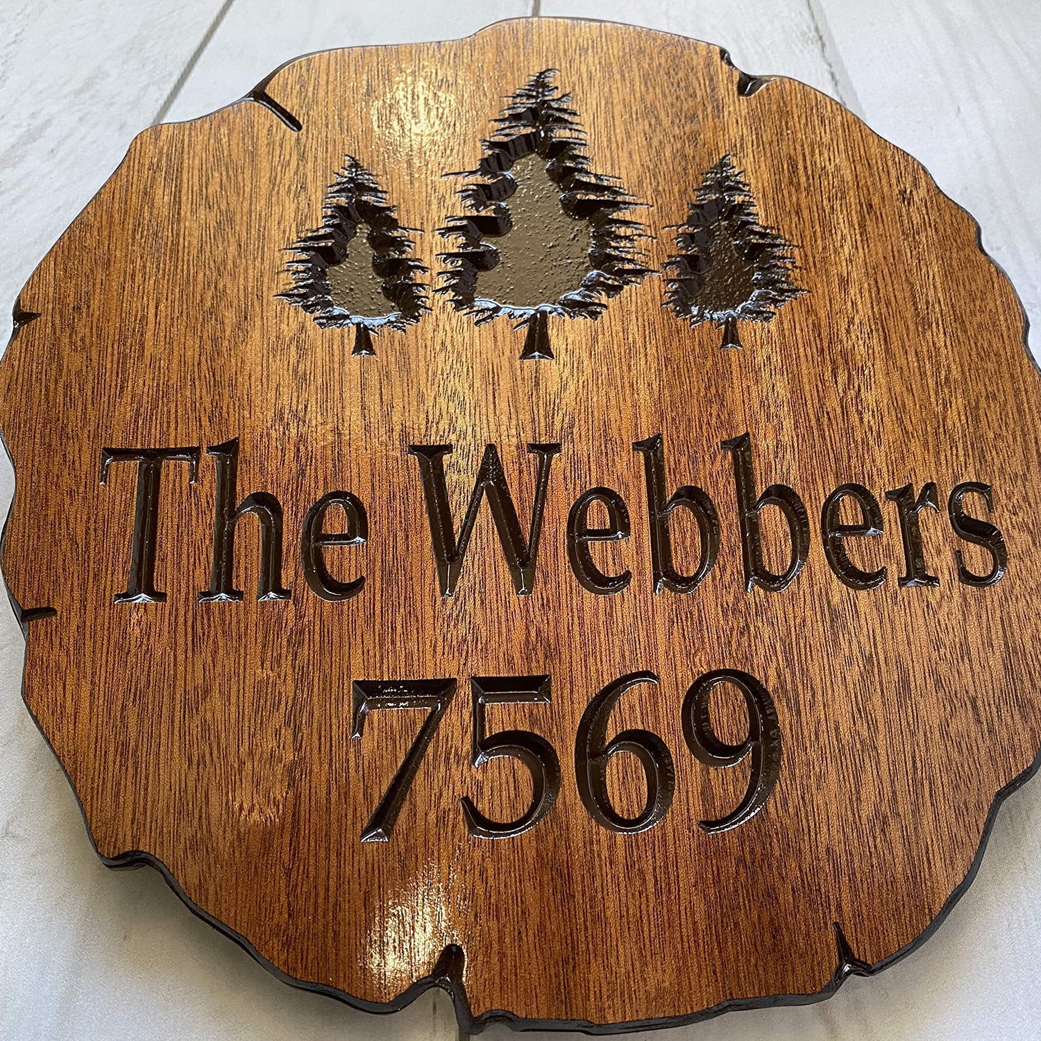 Details: Our personalized ''log slice'' cabin sign is sure to impress friends and family when they visit. Carved from premium solid Mahogany (NOT CHEAP PINE) and suitable for outdoor display. These signs come standard with the pine tree images and whatever personalized text you enter in the customization section. All of the text and images are permanently carved deep into the wood. We never use cheap vinyl stickers or hoaky stencils and paint. These signs measure approximately 11x11 ( larger sized available) and roughly 3/4 thick. Each comes with proper mounting hardware and instrtuctions. Made in the USA. Let us create one for you.