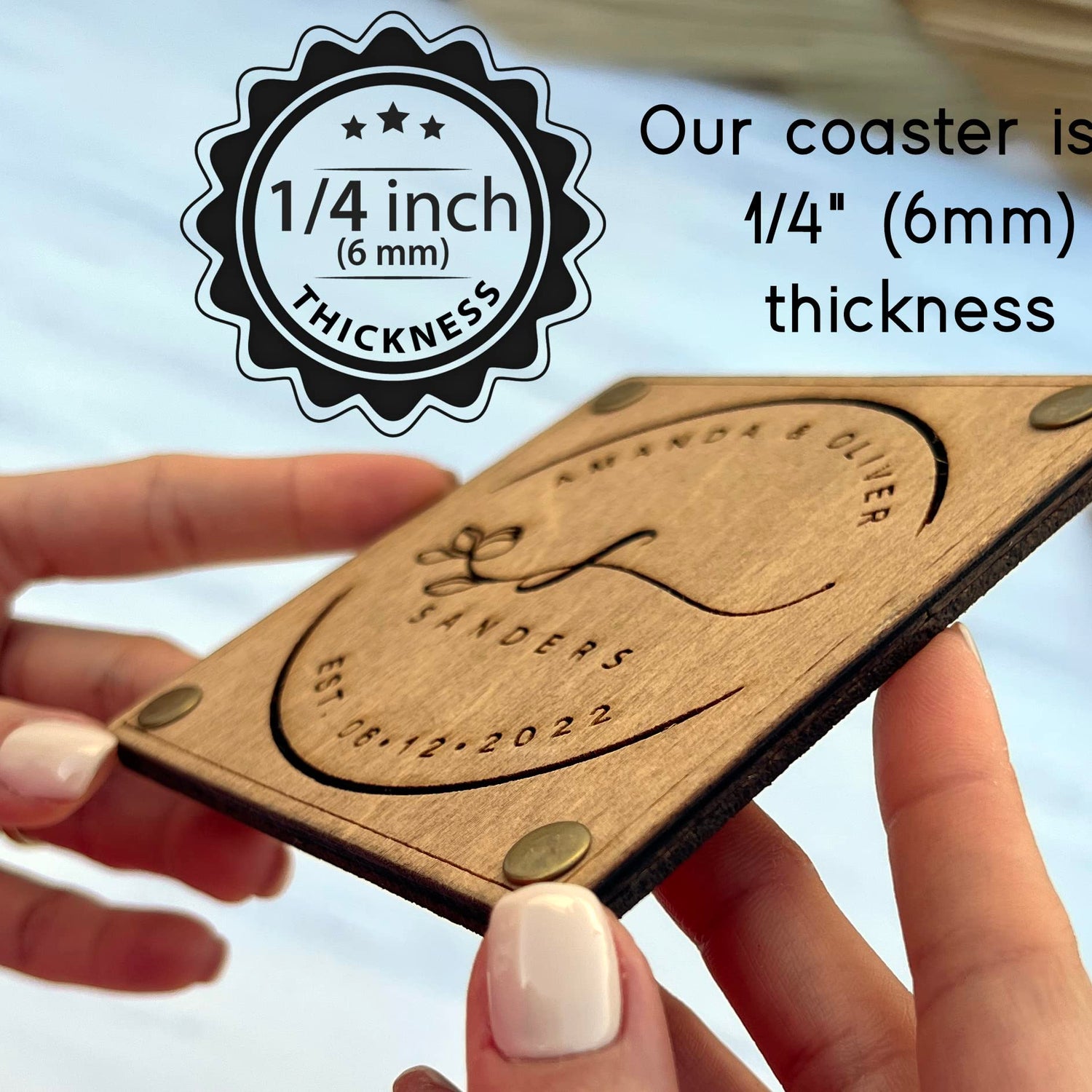 - Each personalized engraved coaster is 1/4'' thick and is made of high quality birch wood with mounted cork backing