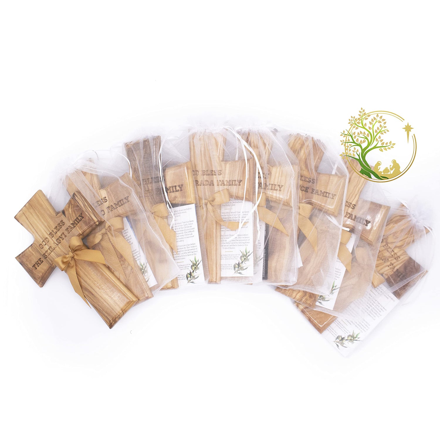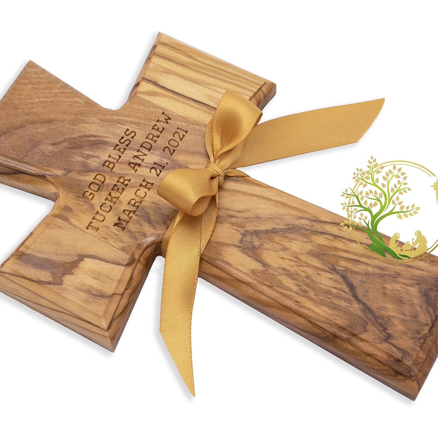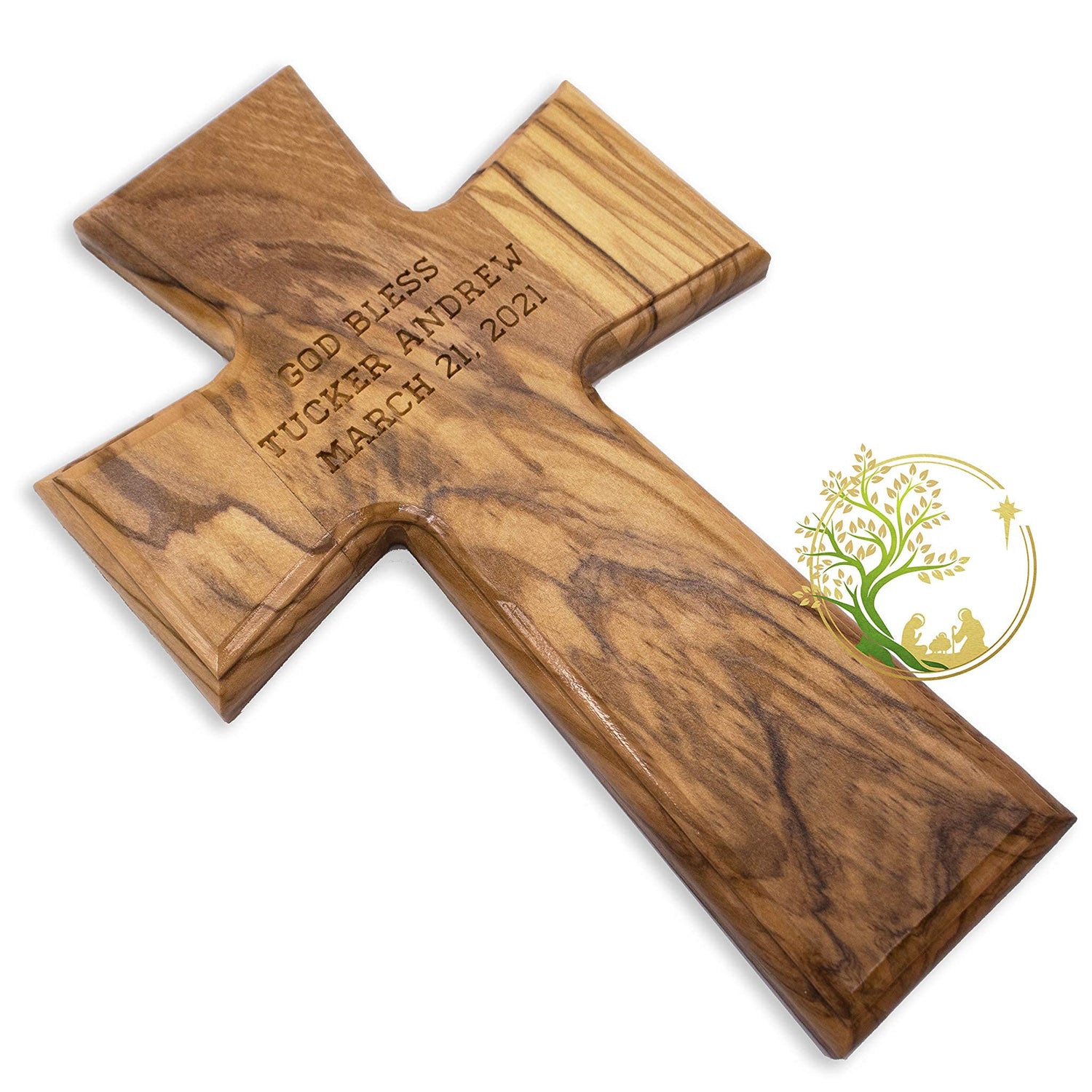 Details: This beautiful personalized cross is the perfect keepsake for many religious occasions such as Baptism, First Communion, Confirmation, Easter and Christmas. It is made from Olive wood. It is the perfect gift for your Godson or Goddaughter on their special day! Each and every branch we select to make our designs is naturally aged and weathered and very unique. No cross is exactly alike due to the variation in the wood grains. Each piece of wood has been carefully carved and constructed into this beautiful cross. The writing on the cross is not like any other cross you see! It is not laser cut or burned into the wood - It is CARVED into the cross which makes it extra unique and keeps the beauty & elegance of the Olive wood! Our crosses are entirely made in the Holy Land - The carving of the customization is done by our shop here in the US. Get this cross as a thoughtful one of a kind handmade gift that is sure to bring blessings and joy to anyone, Adults or kids! The cross measures 8" x 5" and are hang ready. We just started taking customized orders and we are very eager to take your custom order today!