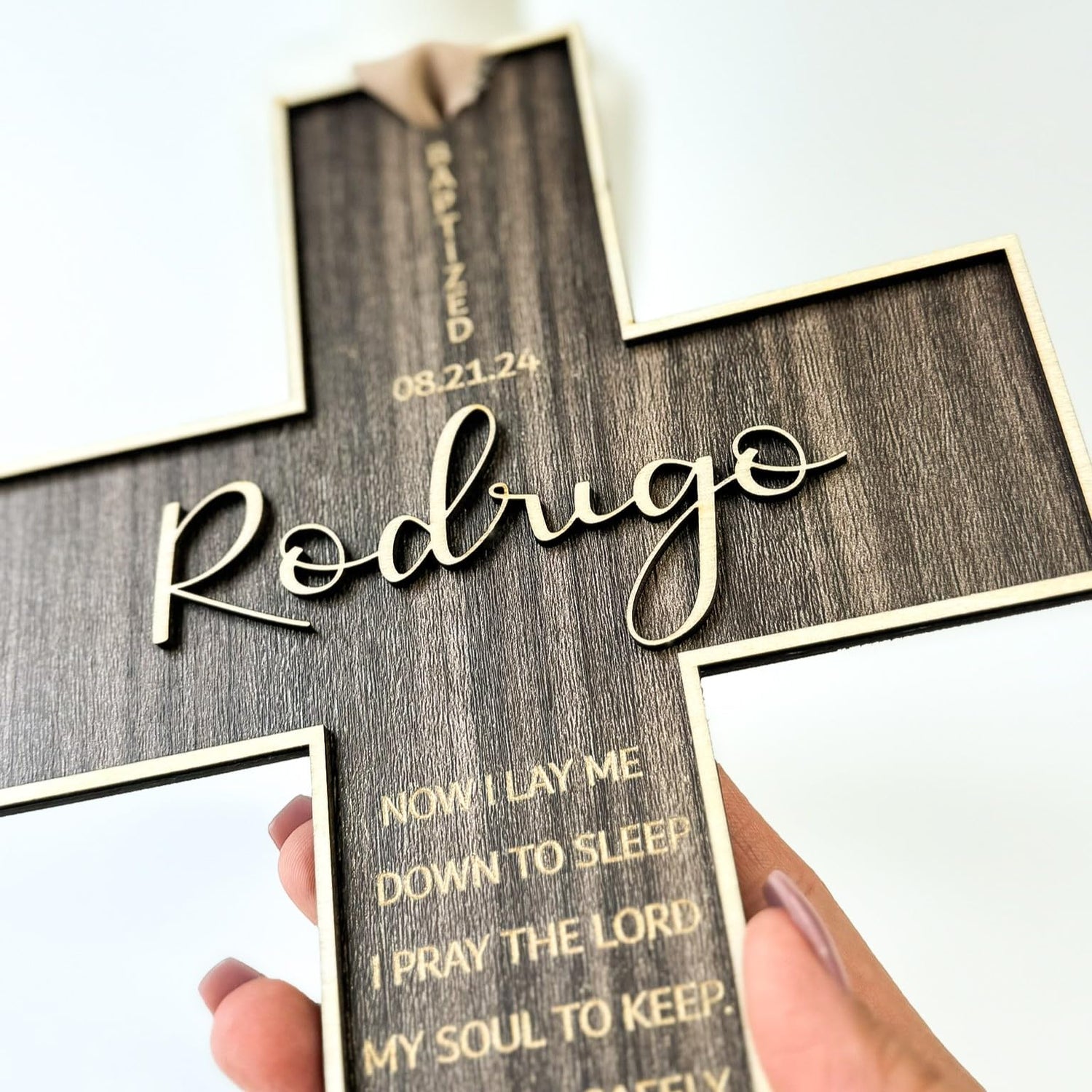 - Handcrafted from high-quality wood: 1/8" Walnut Cross background and 1/8" Basswood for Cross border and Name. Wooden cross height is 10".