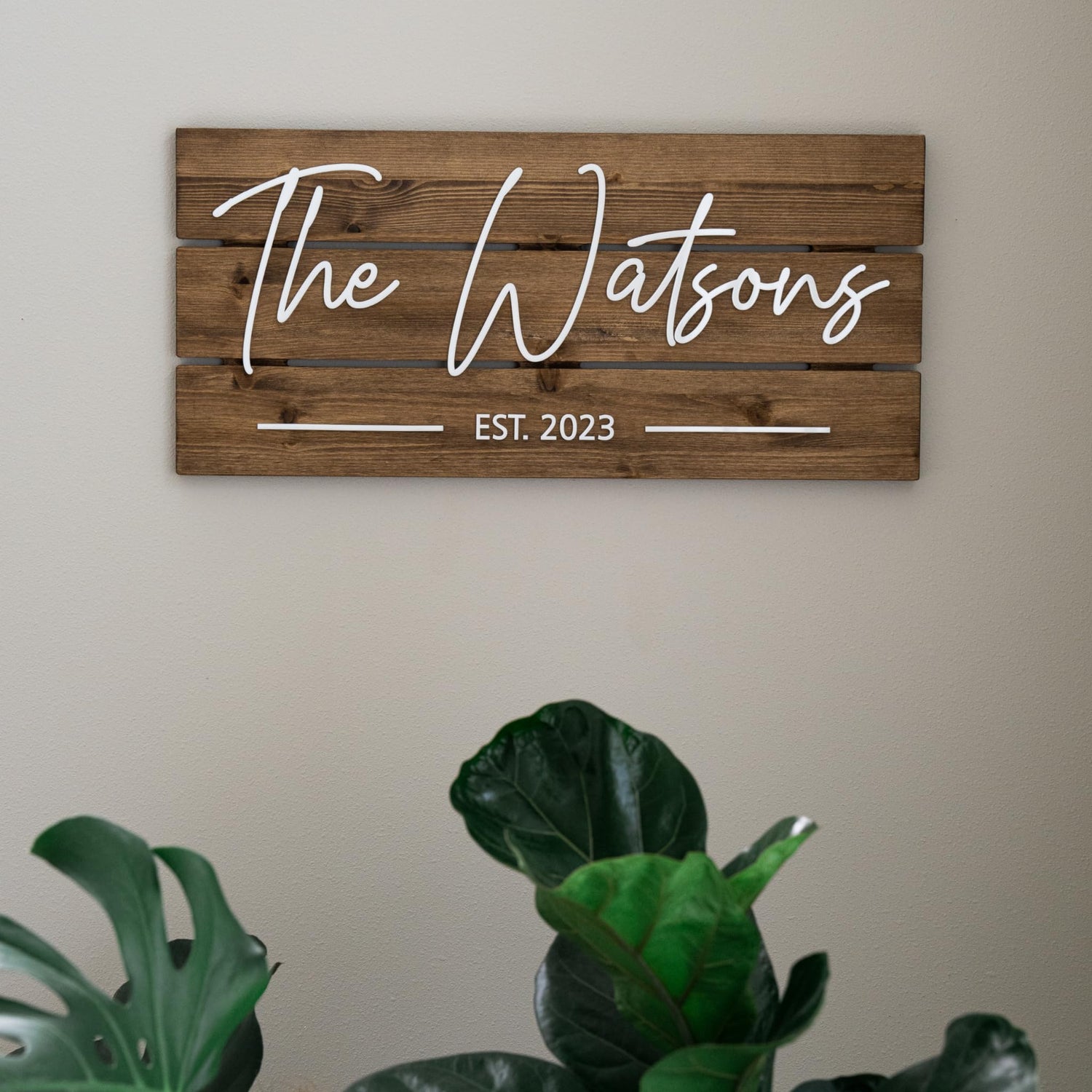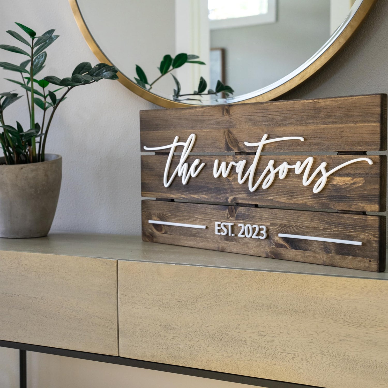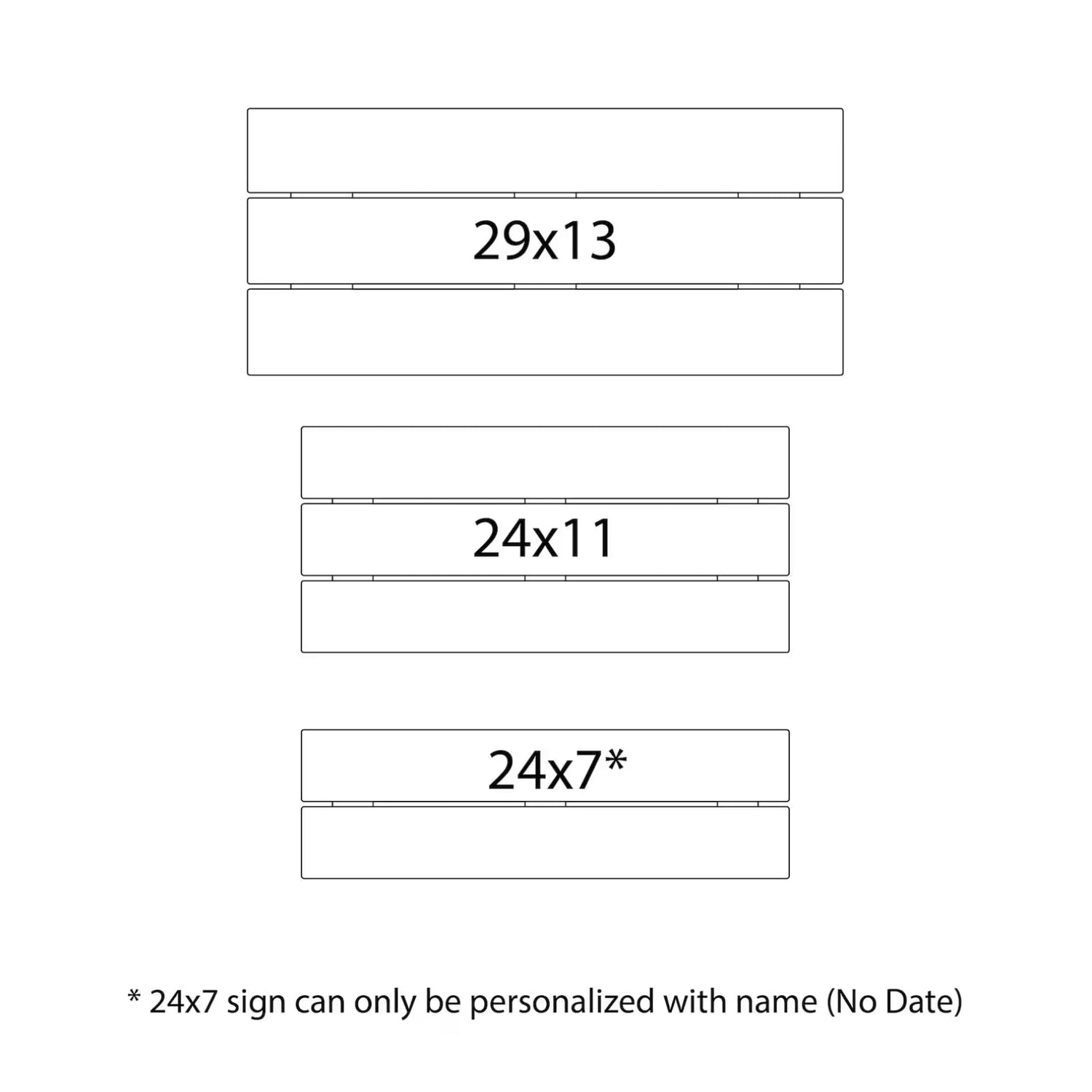 Details: Introducing our collection of exquisite wooden signs crafted from all-natural wood, resulting in a distinctive texture that ensures each piece is truly one-of-a-kind. This listing is for the one personalized sign. No other decor is included. *24x7 sign can only be personalized with name (No Date)