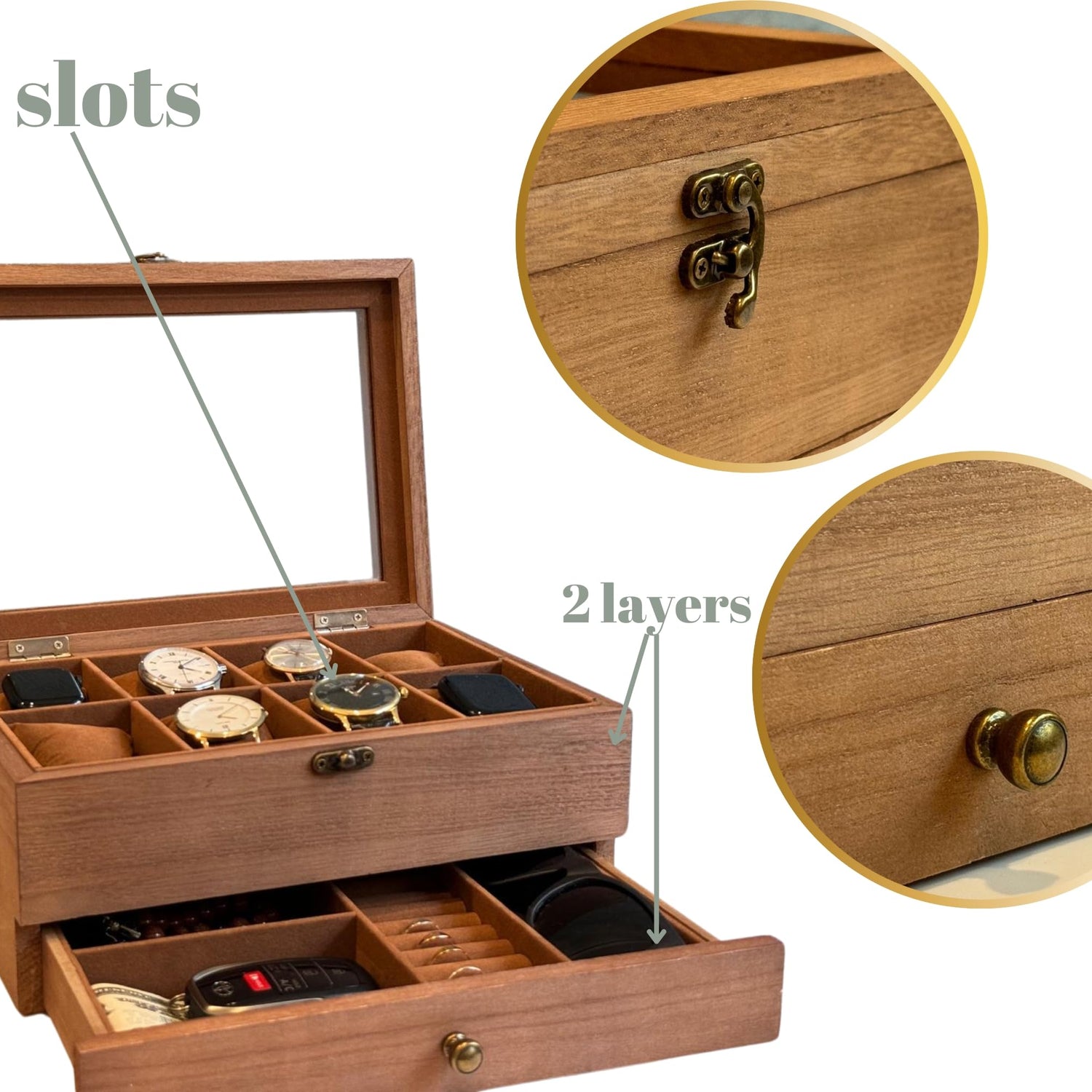 - Elegant 2-Layer Storage: This stylish wooden watch box organizer features 2 spacious layers with 8 slots, perfect for securely storing watches, sunglasses, rings, and jewelry.