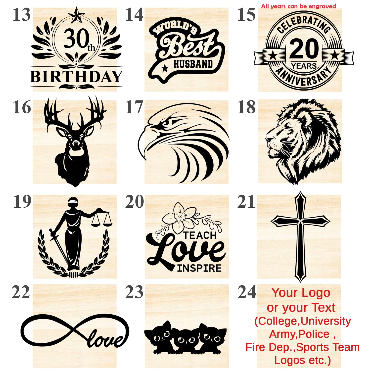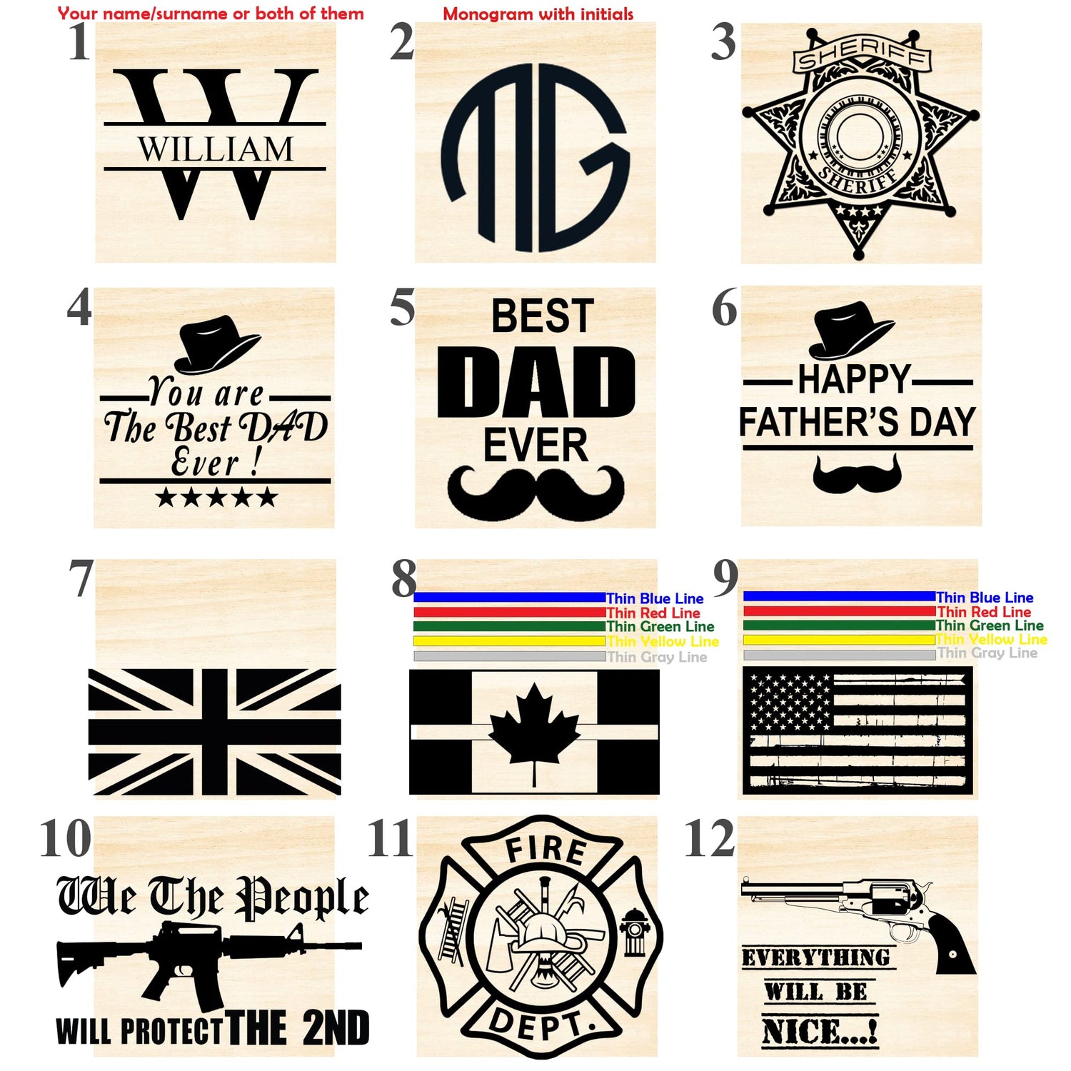 - For Personalization: After looking at the product pictures, please write your logo number and write your other personalization details. For example: Logo 9 - American flag with thin blue line - Oscar Douglas at the top