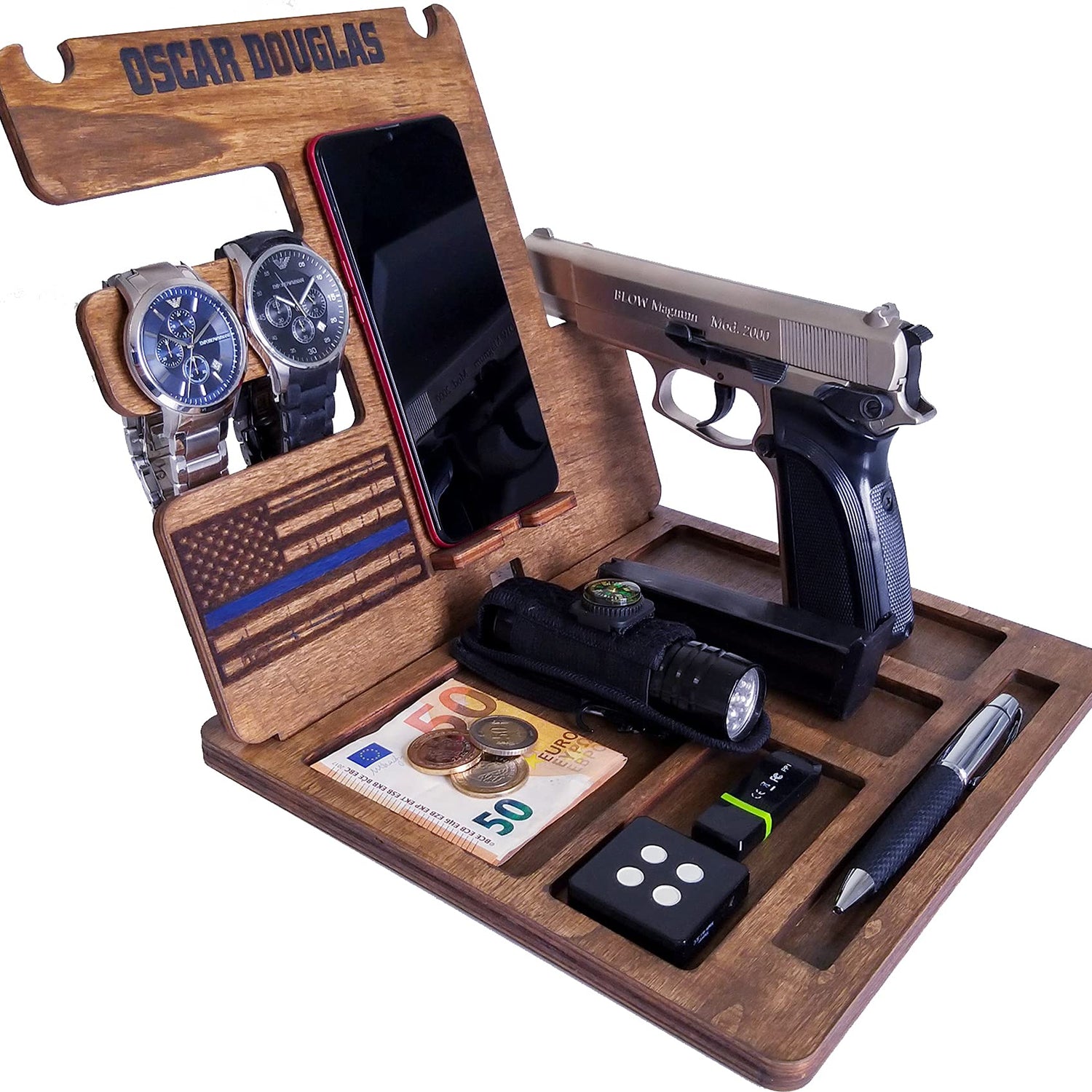 - Personalized with a name or a logo, making it a great Personalized Wood Phone Docking Station Gun Key Holder Wallet Stand Watch Organizer Men Gift Husband Wife Anniversary Dad Birthday Nightstand Purse Father Graduation Gift Male Travel Idea Gadgets
