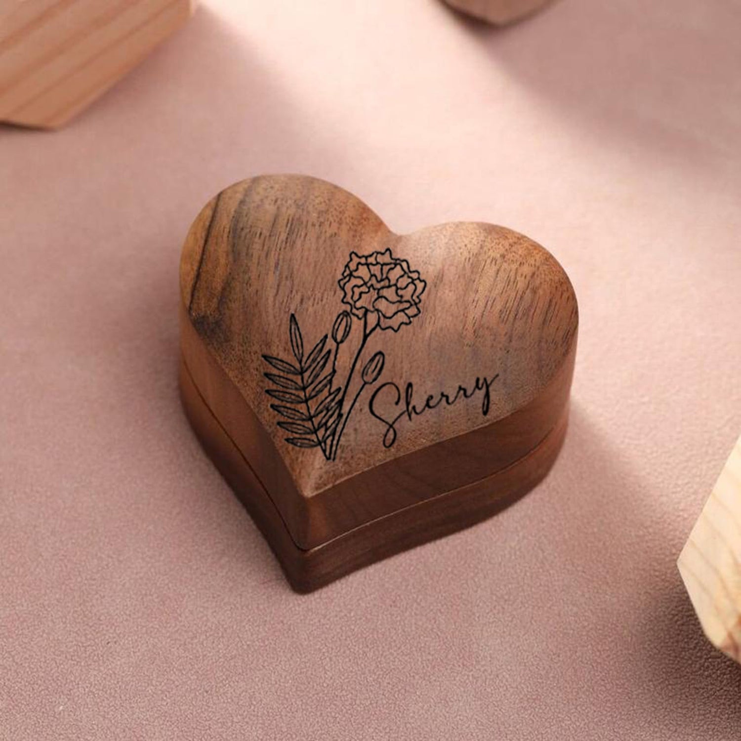 Personalized Wooden Ring Box - Custom Name Date Engraved Ring Bearer Box Wooden Heart Wedding Ring Holder Rustic Jewelry Storage Case for Proposal Wedding Keepsake (Birth Flower)