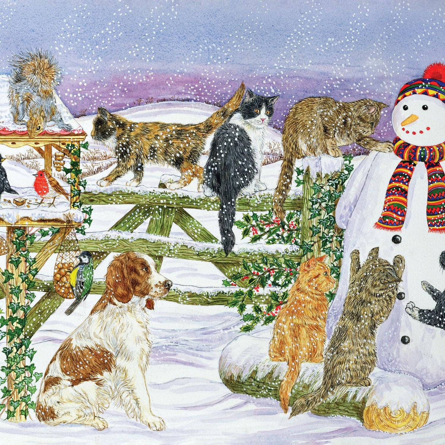 Details: A hat- and scarf-bedecked snowman is surrounded by furry and feathered friends on this sweet winter-scene jigsaw puzzle.