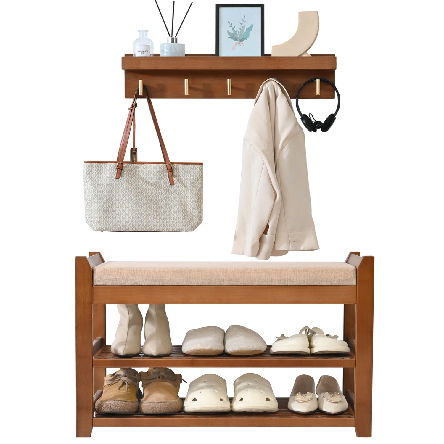 - SLEEK & STYLISH - Featuring an elegant design and natural bamboo wood finish, our shoe storage bench with coat rack effortlessly complements any home decor style, adding warmth and sophistication to your entryway or hallway.