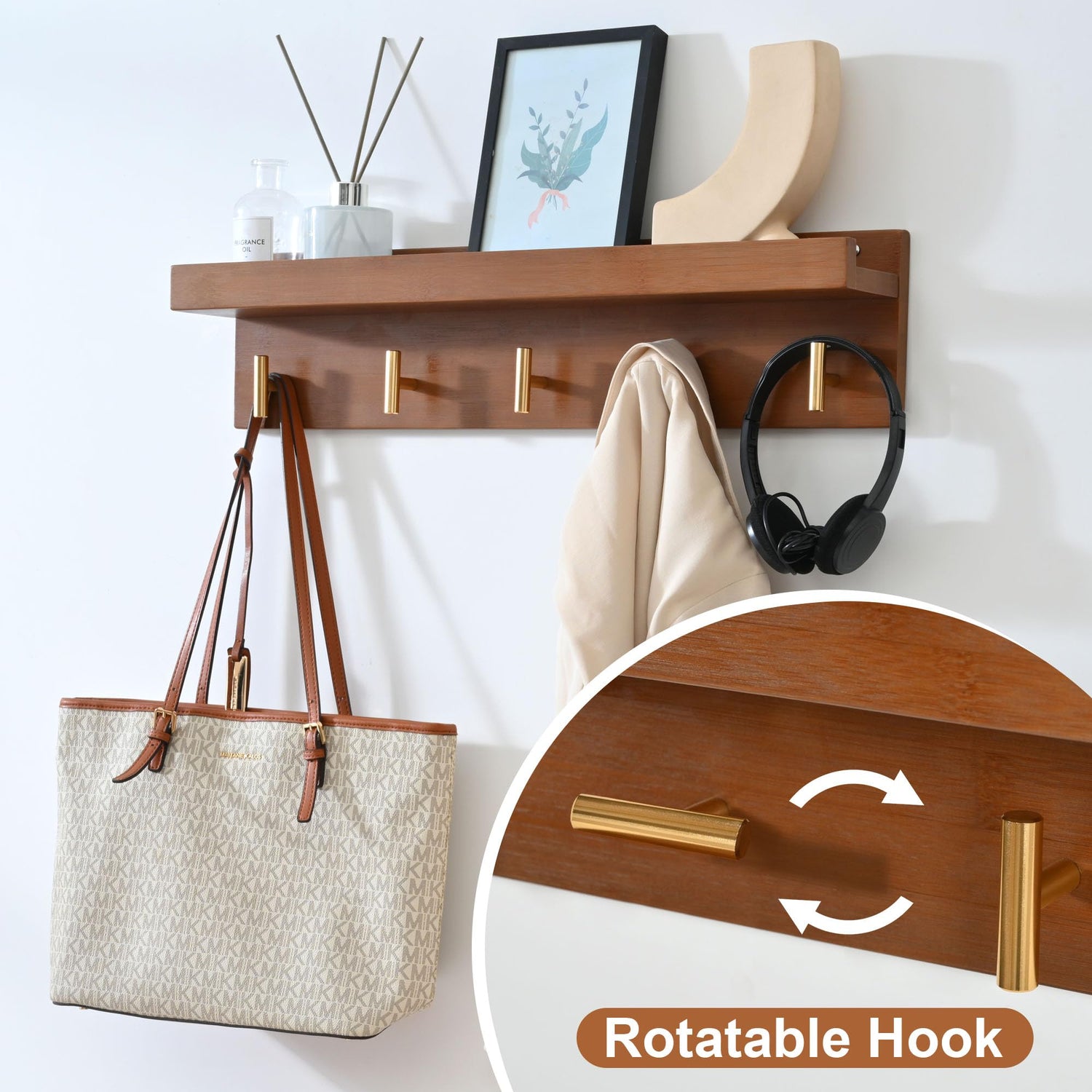 - WALL-MOUNTED COAT RACK - The upper shelf area of the coat rack provides space for decorations such as photos or potted plants. The coat rack features 5 T-shaped hooks, and it can be rotated as neededs.