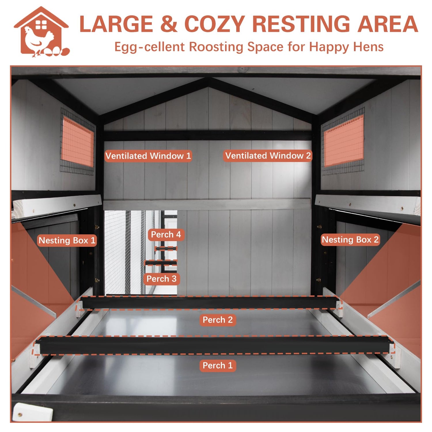 - đĽăCOZY RESTING & WEATHER-RESISTANT SHELTERăOur Large Chicken Coop is designed to prioritize the comfort and well-being of your pet friends. Featuring four sleeping perches, it provides a cozy spot for chickens to rest and sleep, ensuring they enjoy a peaceful environment. Complementing this comfort is the asphalt and UV-resistant roof, delivering durability and protection against various weather conditions.