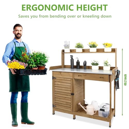 PetsCosset Garden Potting Benche Table Outdoor Wooden Work Station W/Metal Table top,Cabinet,Drawer,Large Bottom Shelf,Open Shelf Natural Wood-Brown-Brown