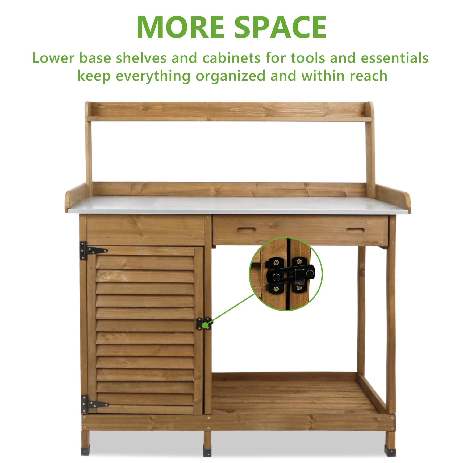 - Ample Storage Options: Equipped with a secure storage cabinet with a door latch, a large bottom shelf, and a sliding drawer, this potting bench provides ample space to store all your gardening essentials neatly.