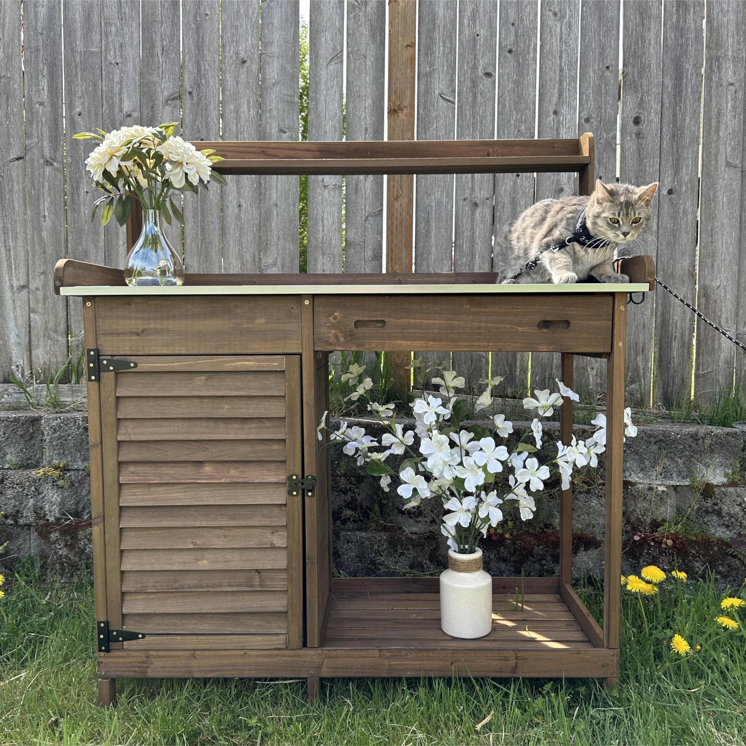 - Quality Fir Wood Construction: Made entirely from 100% Fir Wood, the PetsCosset Potting Bench measures 41" L x 16" W x 49" H. Its robust metal tabletop can hold up to 220 lbs, while the bottom shelf and cabinet bear up to 176 lbs, offering durability and reliability.