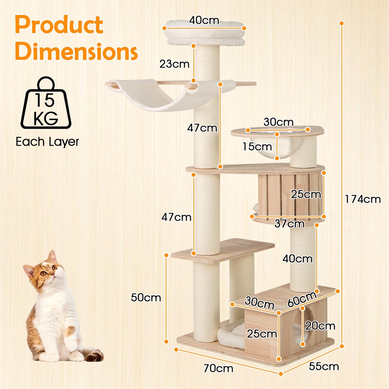 Our extra large wood cat tree tower measures 27.5" x 21.5" x 69"/70 x 55 x 174 cm (L x W x H) and features 8 layers, which could meet the cat's needs of climbing, playing, scratching, lounging, napping, and overlooking. Built with 5.7"/14.5 cm thickened supporting posts and solid rubber wood plywood platforms, this wooden cat furniture ensures excellent stability and prevents any wobble as your cat climbs or lounges. Your cat will love lounging in the various resting spots available, from the cozy top perch and 2 breathable condos to a plush hammock and a transparent space capsule. And there are several fully-wrapped scratching posts to encourage natural clawing behavior. For ultimate comfort, there are padded cushions covered in skin-friendly plush fabric, creating a cozy and inviting retreat for your cat to rest and play. And they are removable and machine washable for easy cleaning. Treat your cat to the luxury and comfort they deserve with our tall wooden cat tree.