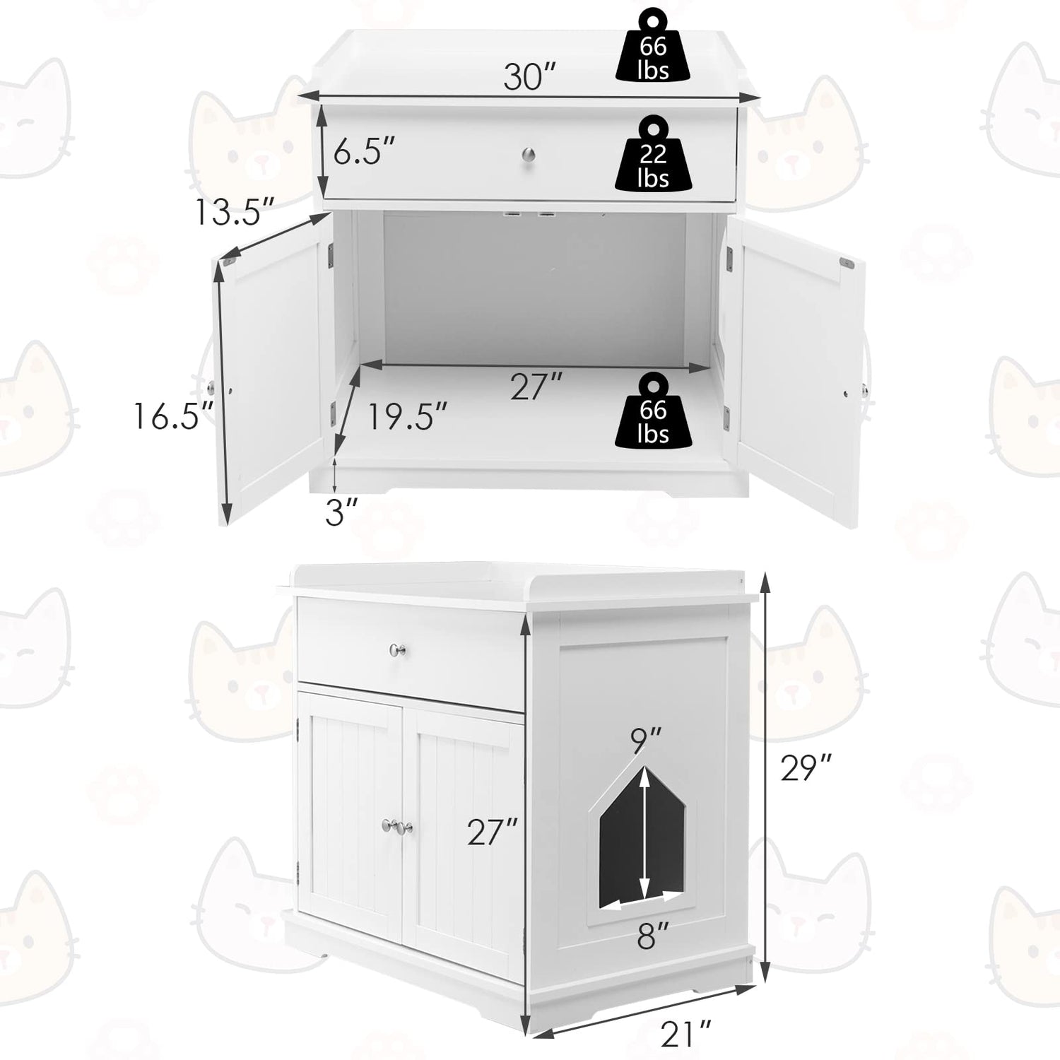Details: Description: Provide Your Lovely Kitten a Safe & Warm House! Our cat litter box enclosure is designed with a smooth-sliding drawer to store items away from dust and a large tabletop with guardrails to display decorations and store items within reach. And the large interior can be put into a cat litter box, cat nest, or cat food. It can not only be a practical cat washroom but also can be used as a side table, bringing convenience to your daily life. The hidden litter box enclosure can effectively reduce the amount of litter your cat brings out of the litter tray while holding all the odors inside. And there exist 2 doors for easy access and daily cleaning. It can not only provide privacy for kittens but also keep your home clean and tidy! Features: Can be used as a cat litter box enclosure, cat house, side table, end table, nightstand The drawer and large tabletop provide enough space for storing kittens’ necessities Provides privacy for potty time, cats feel safe in this process The cat-size hole allows cats to jump in or out easily while helping promote ventilation The internal magnetic catch prevents cats from opening the door from the inside The protective top guardrails prevent items from falling to hurt your kitten The MDF board is coated with premium NC painting, waterproof for easy cleaning With the modern and fashionable style, can blend into any room’s decor Specifications: Color: White, Brown Material: MDF Overall Dimensions: 30” x 21” x 29” (L x W x H) Interior Size: 27” x 19.5” x 16.5” (L x W x H) Dimensions of Cat Hole: 8” x 9” (L x W ) Total Weight Capacity: 154 LBS Net Weight: 50 lbs