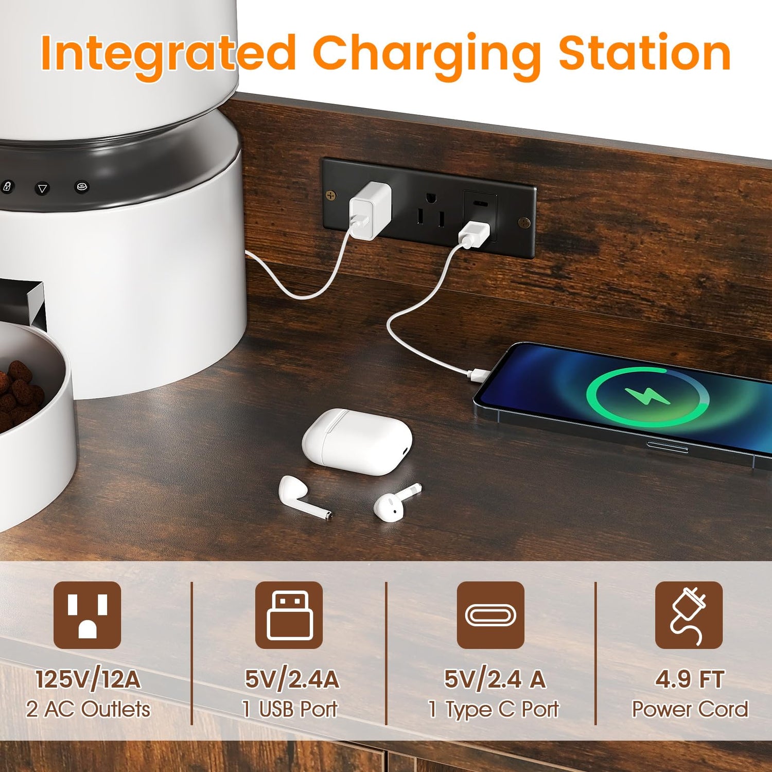 - Integrated Charging Station: The litter box enclosure furniture features a built-in power station including 2 AC outlets(125V/12A), 1 USB port(5V/2.4A) and 1 Type-C port(5V/2.4 A), facilitating continuous power supply for automatic cat feeders, smartphones, and laptops.