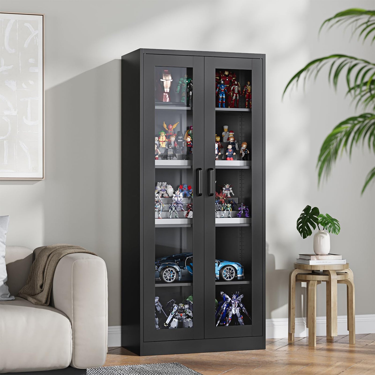 - All-Steel Druable Material- This display cabinet is manufactured with a reinforced heavy-duty steel luxury welded frame, which the overall steel frame can be up to 0.8mm thick, allows each shelf to hold up to 150 pounds when in use. The surface is sprayed with environmentally friendly paint, which can resist scratches and corrosion for long-term no-worry use.