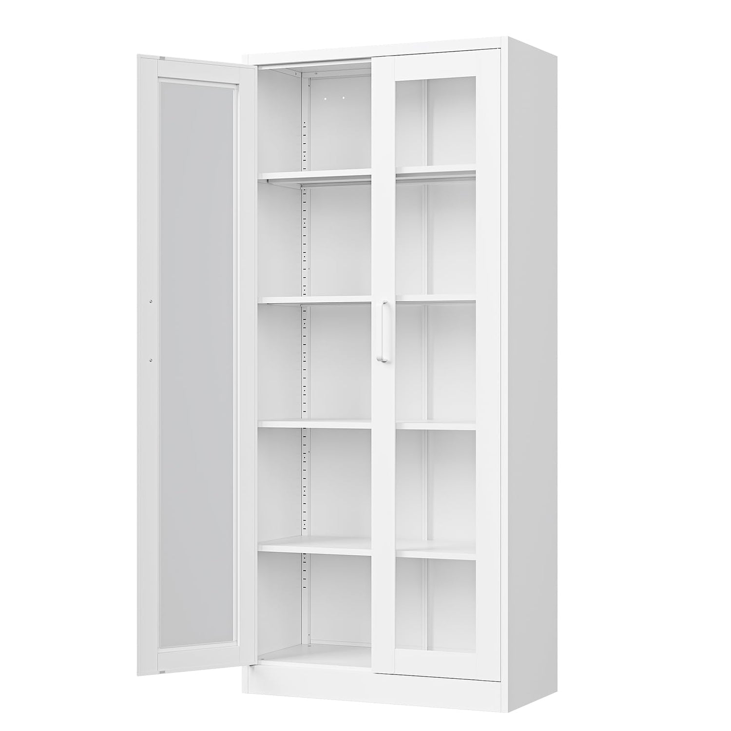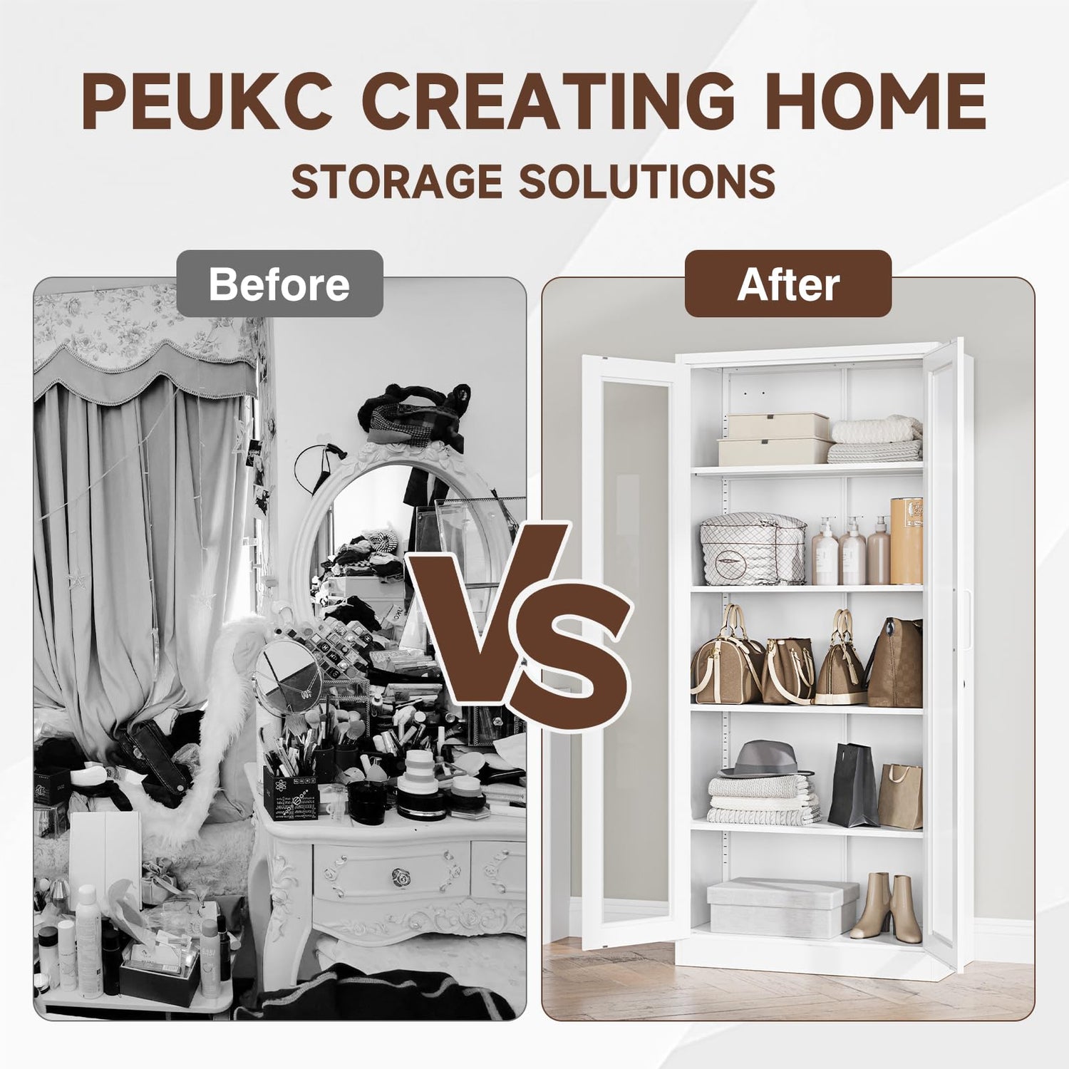 PEUKC Display Cabinet with Glass Doors, 67-inch Curio Cabinets with 4 Adjustable Shelves, HD&Tempered Glass Cabinet Display Case for Home, Office, Clinic, Pantry, Assemble Required, White