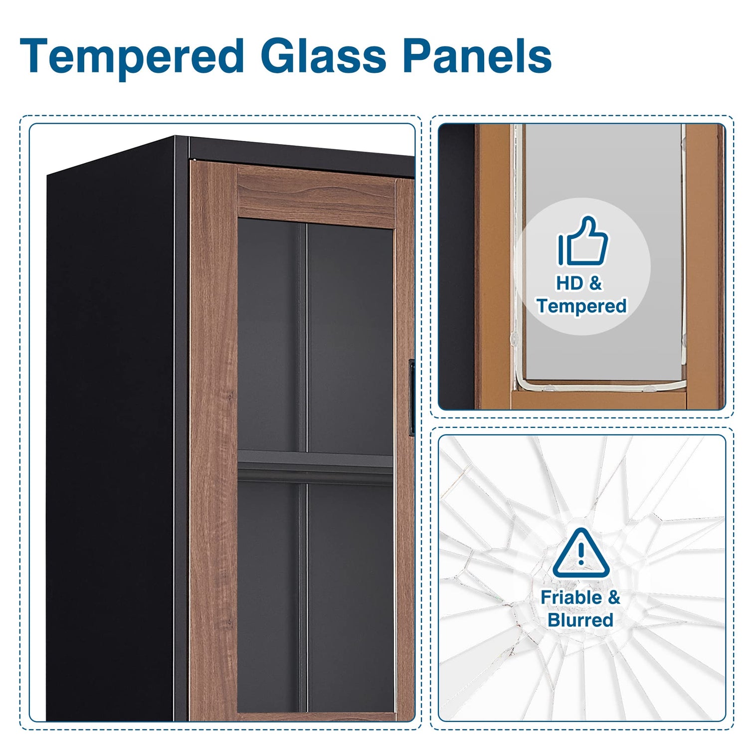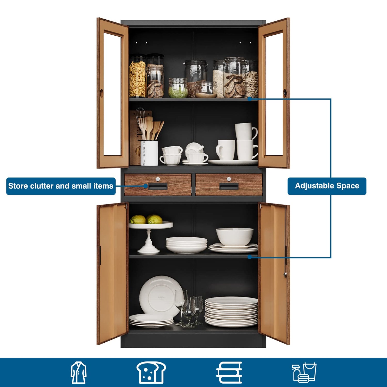 - Upgrade Tempered Glass Door- Kitchen pantry storage cabinet equiped 2 metal doors and 2 galss doors. This top 2 doors for the pantry cabinet with high-definition tempered glass, so that the items inside are clear at a glance, easier and fast for you to find wine glasses, tableware,et.