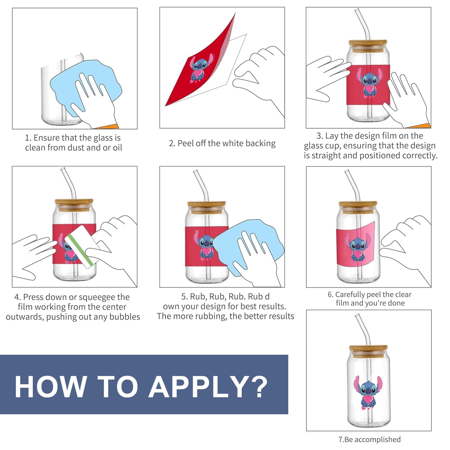 - Versatile Decor: These uv dtf rub-on transfers for crafts are suitable for 16-ounce glasses, making them an ideal choice for glassware enthusiasts, they are versatile enough to be applied to any smooth surface, including windows,furniture, water bottles, gift wrapping, cars, and various types of glass.