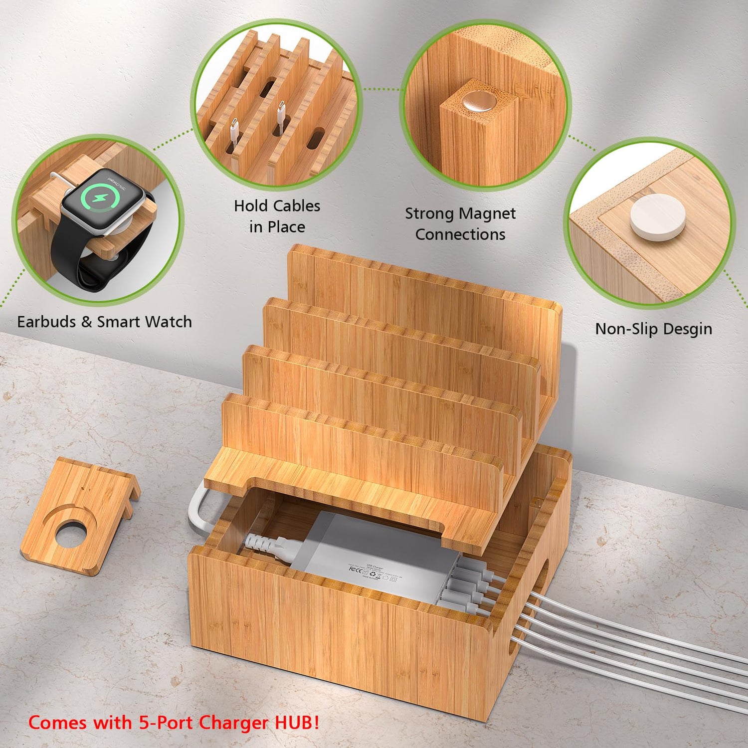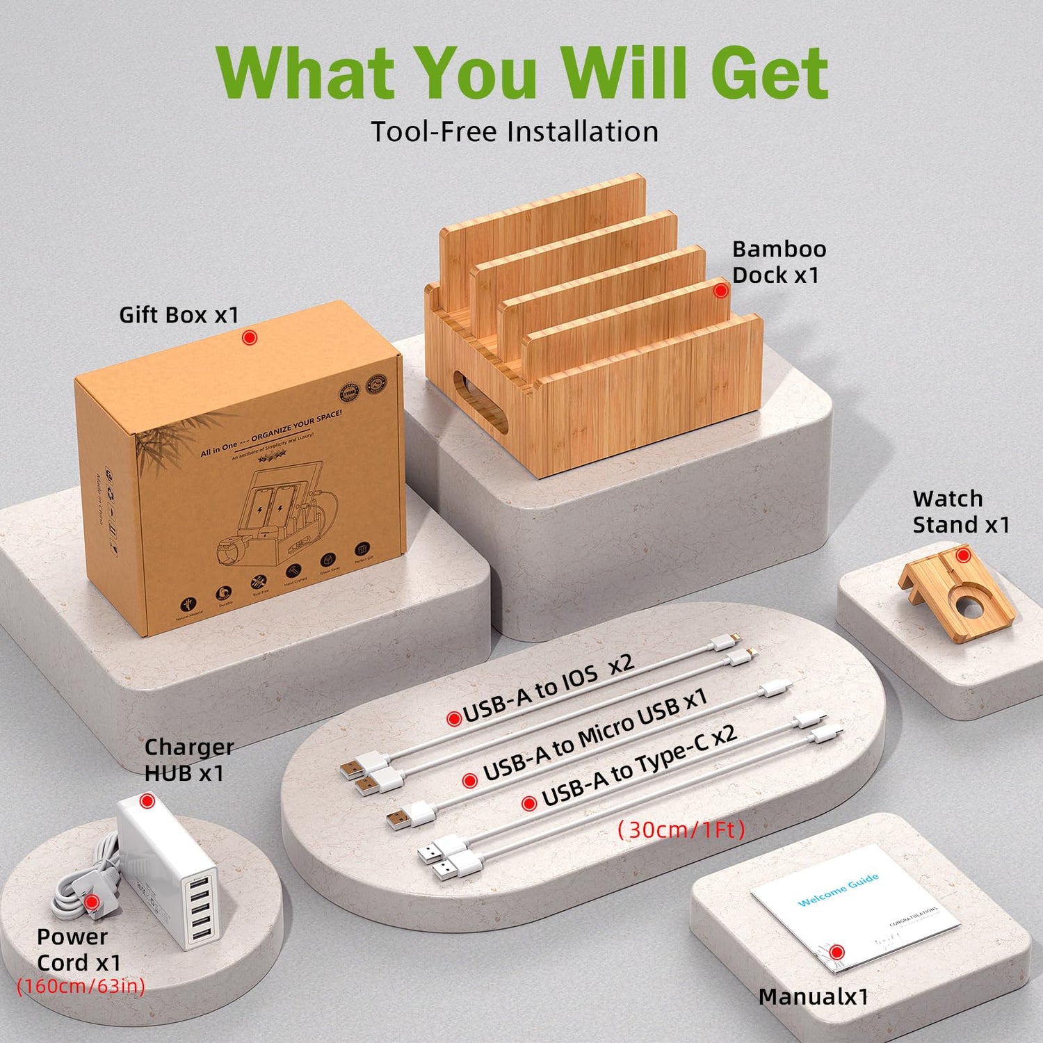 - WHAT YOU GET: 1 Bamboo Charging Station , 1USB Charger and Cord, 5 Cables(Included 2* 1OS cables, 1* Android cable, and 2* Type-C cables). One piece of USB Charging HUB(5Ports), and CORD, an extra Hanging Stand for Smart Watch, and 5 Charging Cables (1Ft). All these fit perfectly in the charging dock