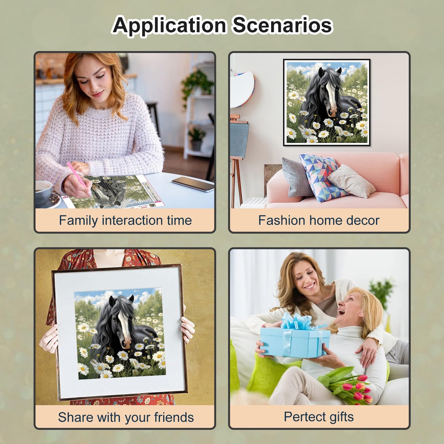 - HIGH QUALITY : Horse Daisy Adult Diamond Painting Kit uses the highest quality materials to ensure that your finished product shines for many years. The letter symbols on the canvas are clear and easy to read, and the glue is super sticky. The color of 5D round diamonds never fades