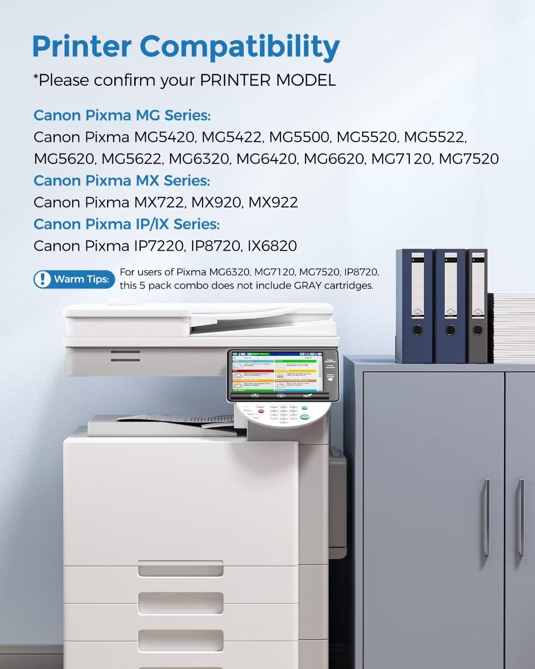 Warm Tips: For users of Pixma MG6320, MG7120, MG7520, IP8720 this 5 pack combo does not include GRAY cartridges.