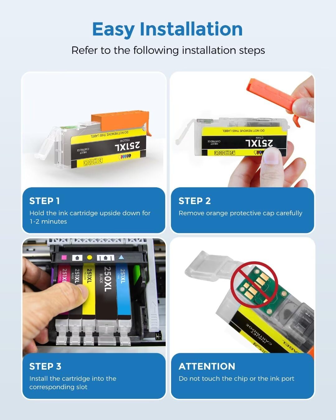- Our 250XL 251XL Ink Cartridges Advantage: Latest Chips | Providing 100% Compatibility | Premium Ink | Free exchange for defective cartridge.