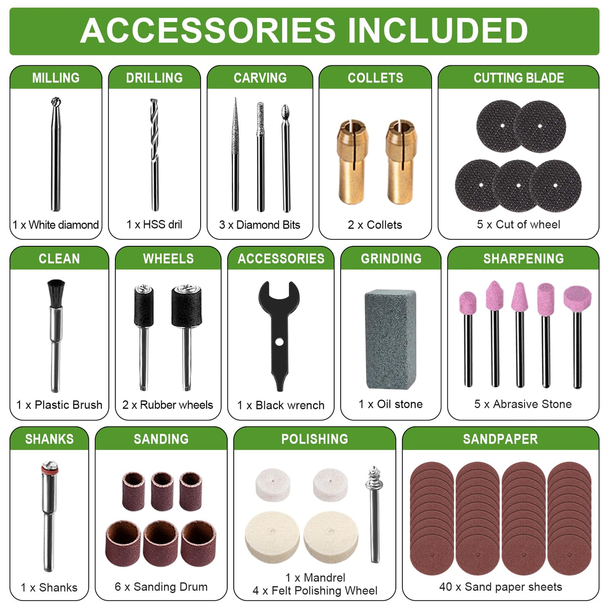 - đ¸ăWhat is included? ăThis rotary tool comes with 73 accessories, a canvas bag, instructions, and a charger. It's perfect for home use and easy to carry around. We offer a one-year warranty and our dedicated customer service team is always ready to assist you.