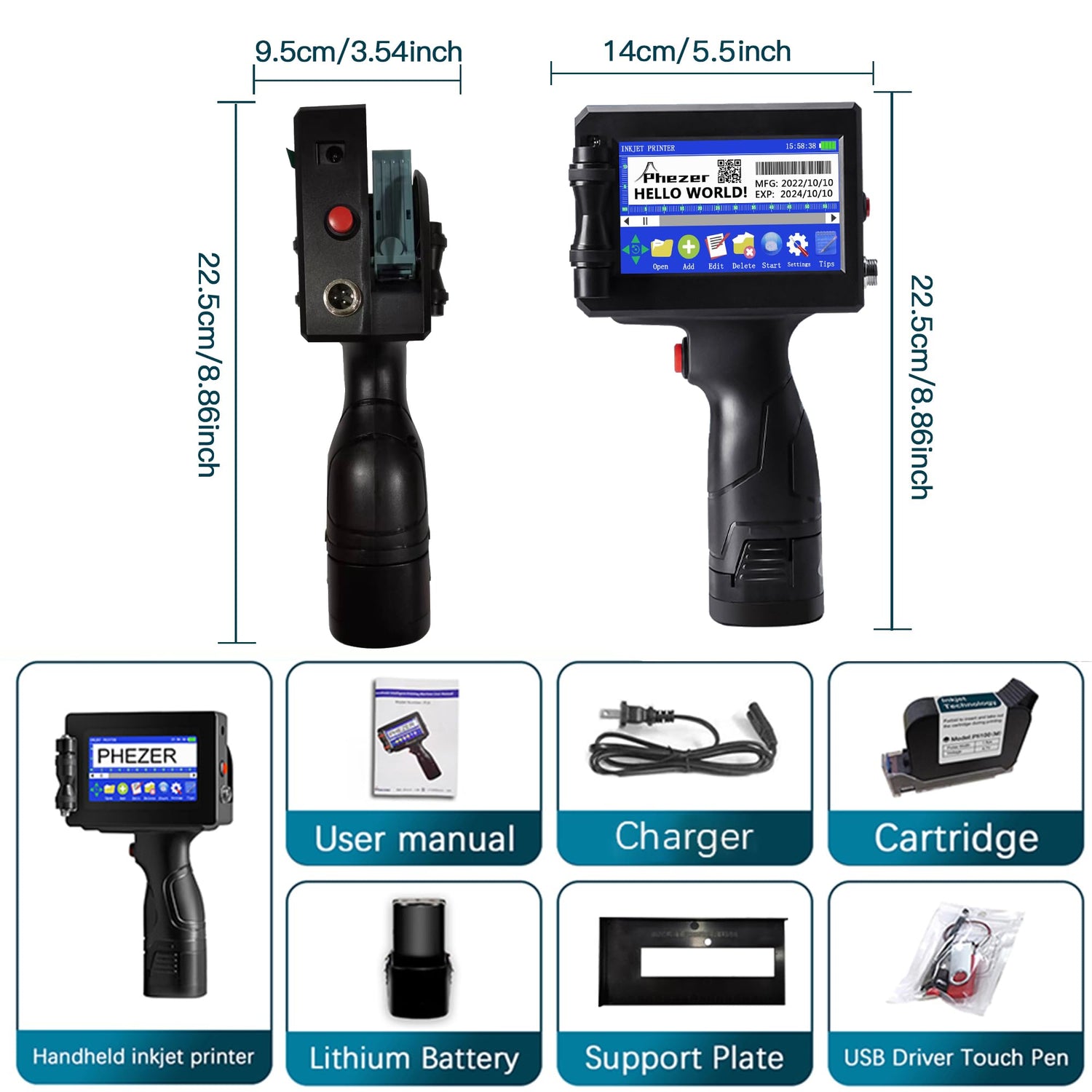 Phezer P15 Handheld Inkjet Printer for Flat Surface 0.5 Inch Nozzle for QRCode Barcode Production Date Time Logo Batch Number Print On Glass Bag Carton Box Wood Cloth Plastic Cable (25 Languages)