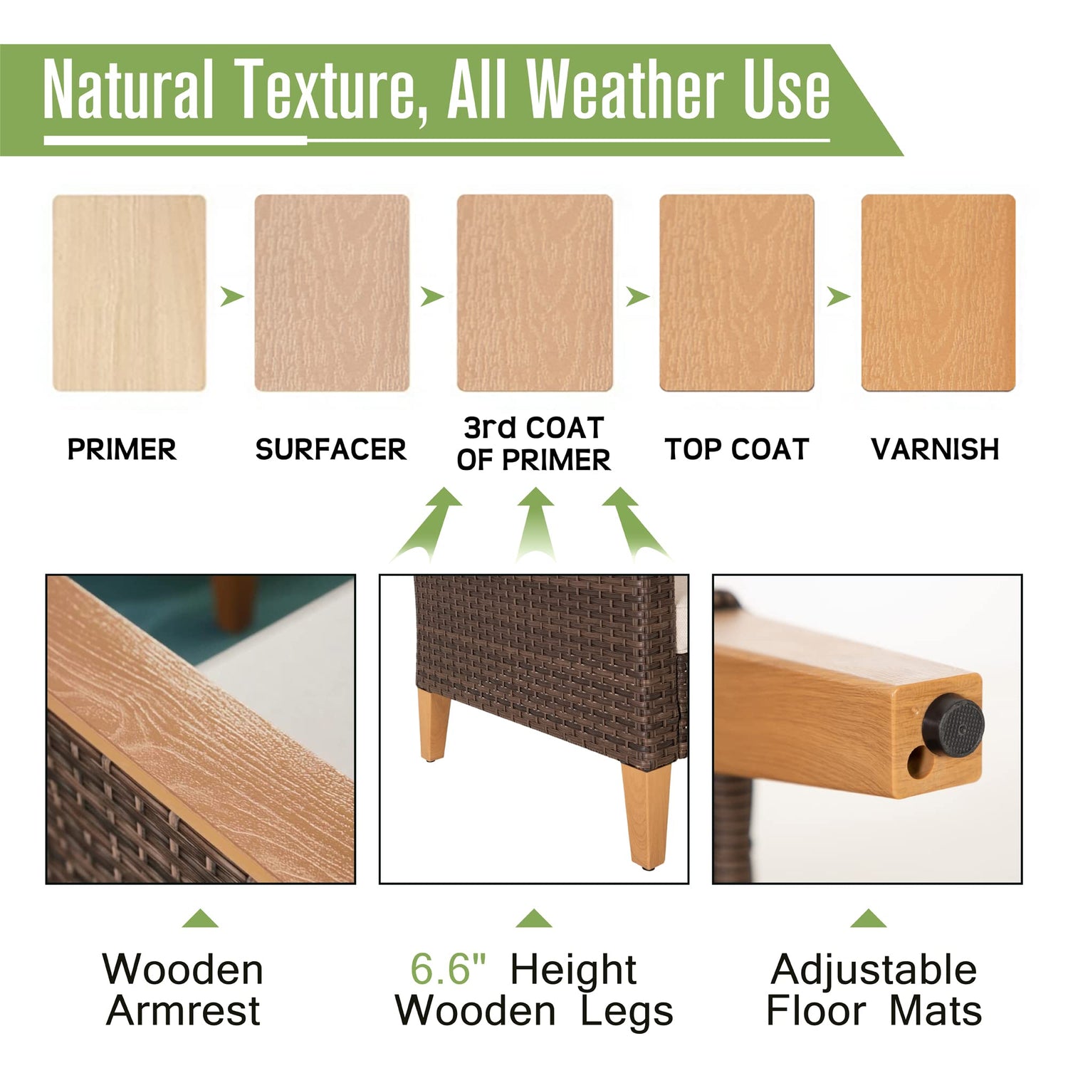 - 【ALL WEATHER USE】Constructed with a sturdy steel frame and premium PE rattan. Special natural wood-like handrails and sofa legs providing excellent support,this outdoor sectional set is designed for all-weather use and guaranteed to last for years. Hand-woven rattan ensures there's no peculiar smell in the finished product, and the service life is three times that of ordinary machine production