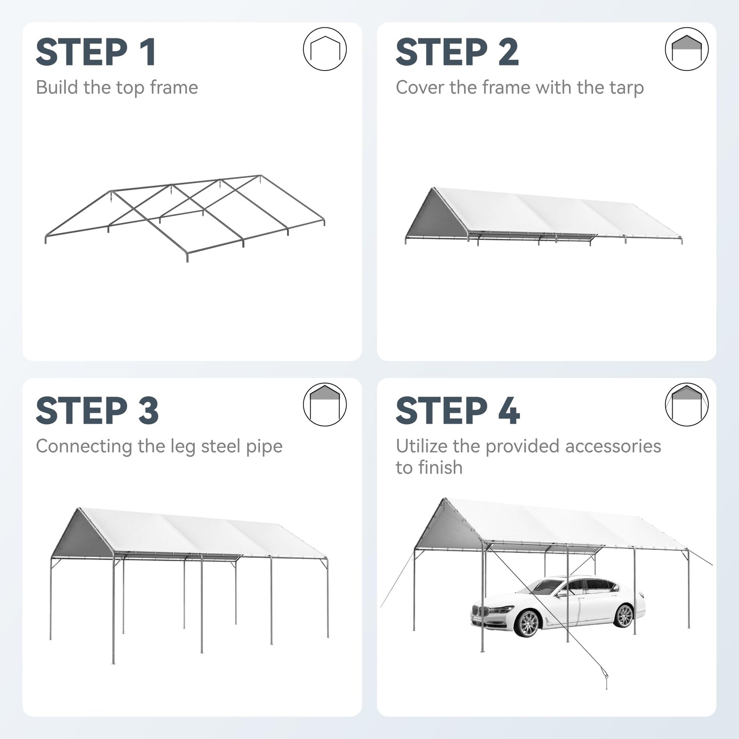 - 【Heavy Duty Metal Frame with 8 Legs】- This car shelter consists of 1.5inch diameter galvanized steel poles with 8 legs, 1.2mm Thicken and 1.65Inch diameter connectors, 4 sturdy windproof ropes, make the whole steel carport much safer and more stable.