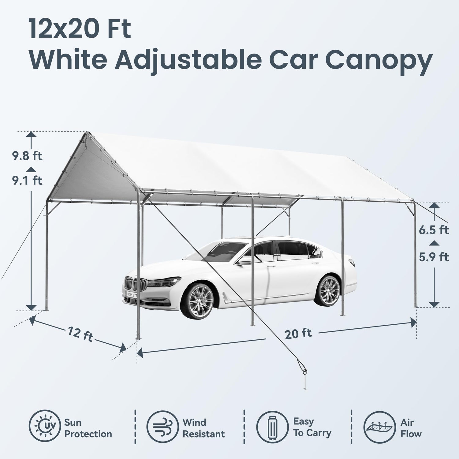PHI VILLA 12x20 ft Heavy Duty Carport Car Canopy Party Tent Adjustable Peak Height, Garage Storage Boat Shelter with Waterproof & UV Protected Tarp, White
