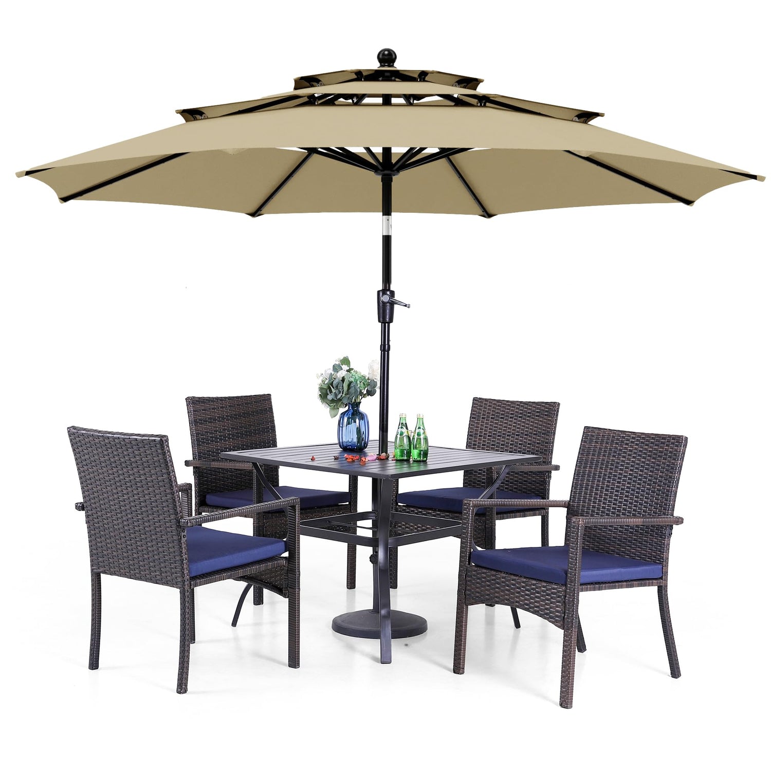 PHI VILLA 5 Piece Outdoor Dining Set with Umbrella, 37" Square Metal Dining Table & 4 Cushioned Wicker Rattan Chairs with 10ft Beige Umbrella for Patio, Deck, Yard, Porch