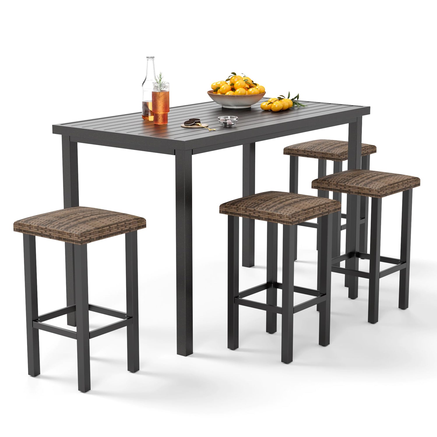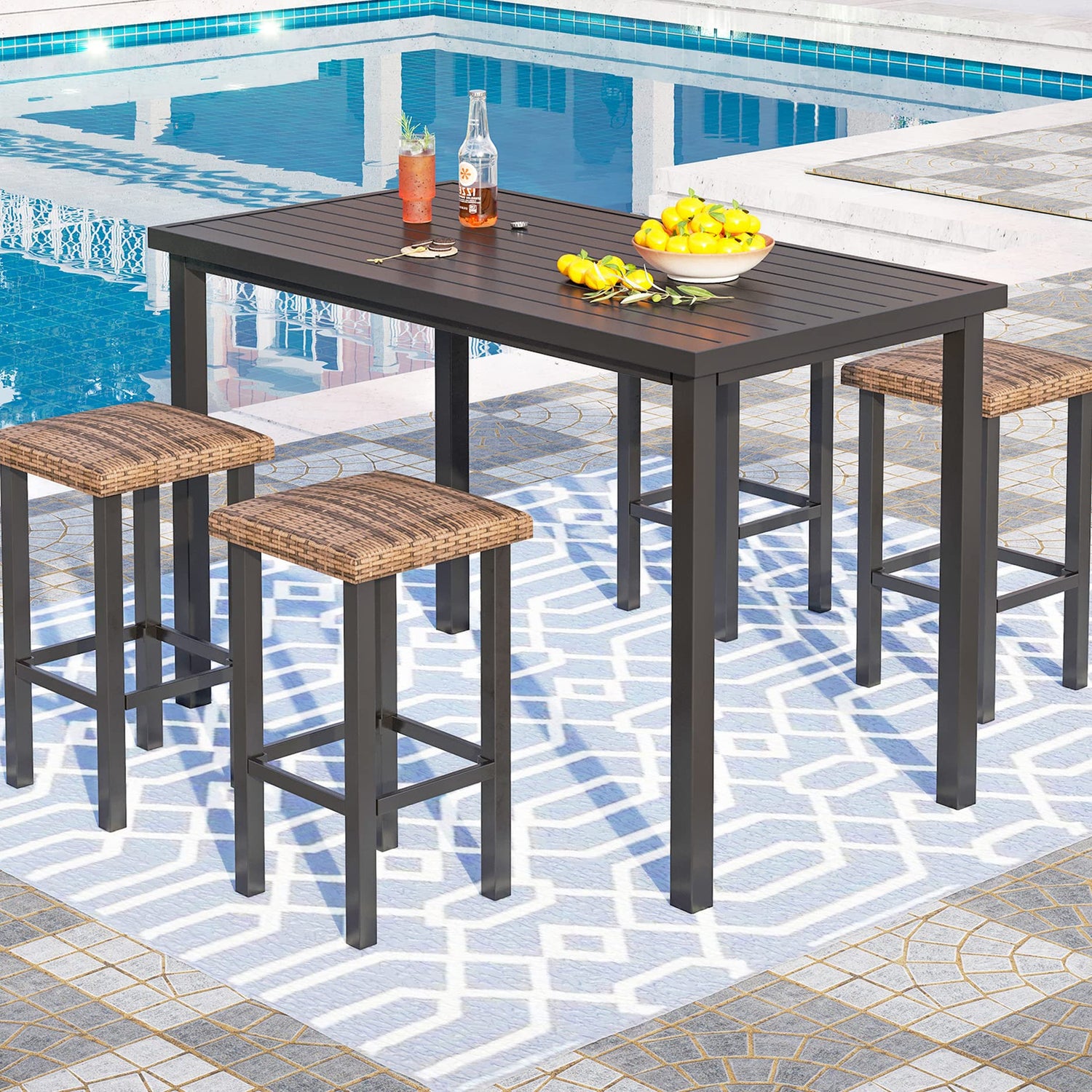 PHI VILLA 5 Piece Patio Bar Set, Black Wood Grain Metal Bar Table & 4 Wicker High Bar Stools, Bar Height Outdoor Dining Set for Porch, Yard, Deck, Poolside