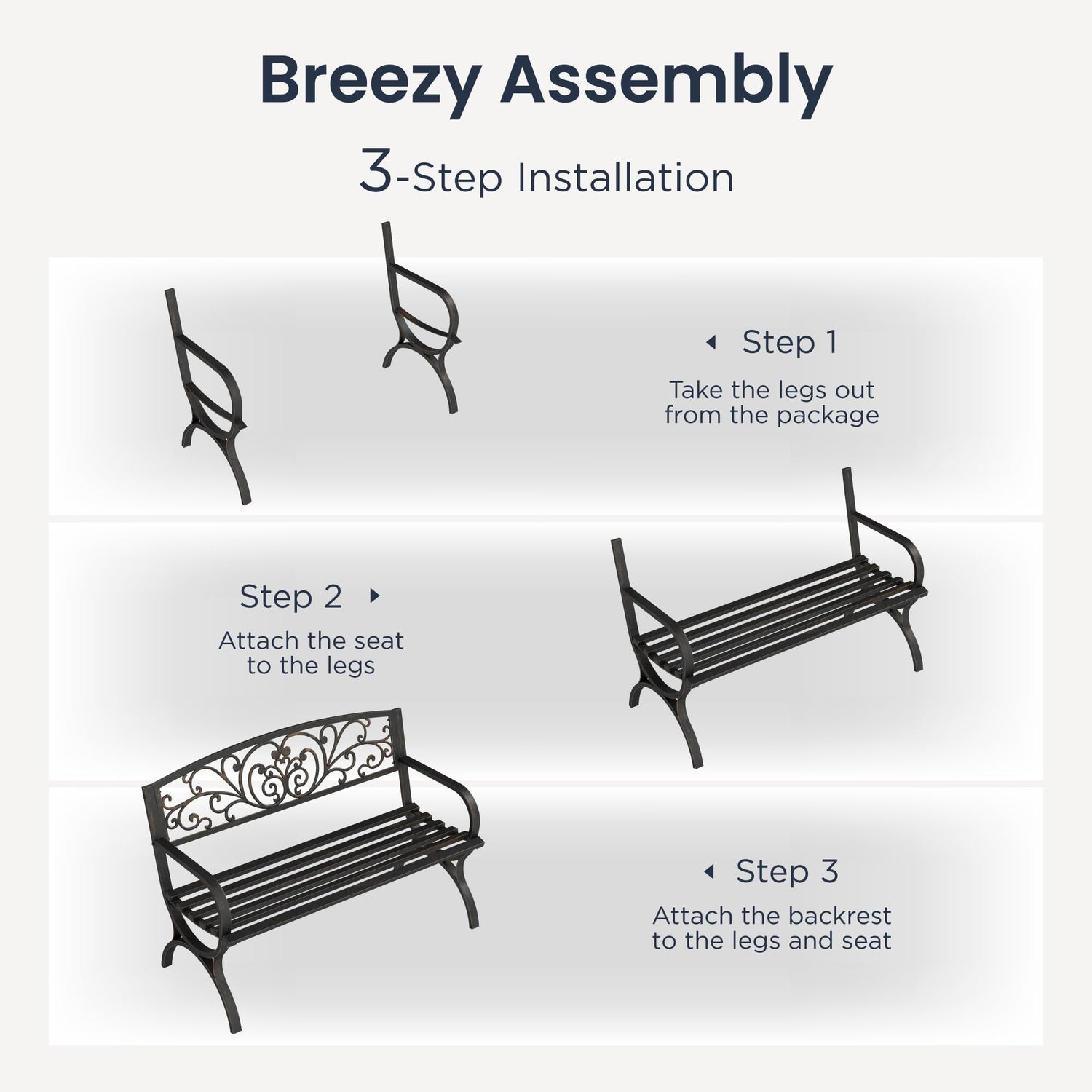 - Easy to Assemble the Metal Bench: Specific manual and complete accessories of the Garden Bench greatly help you spend short time to finish the assembly work. Package included the instruction and screws, nuts and washes. It is easy for one person set it up within 15 mins