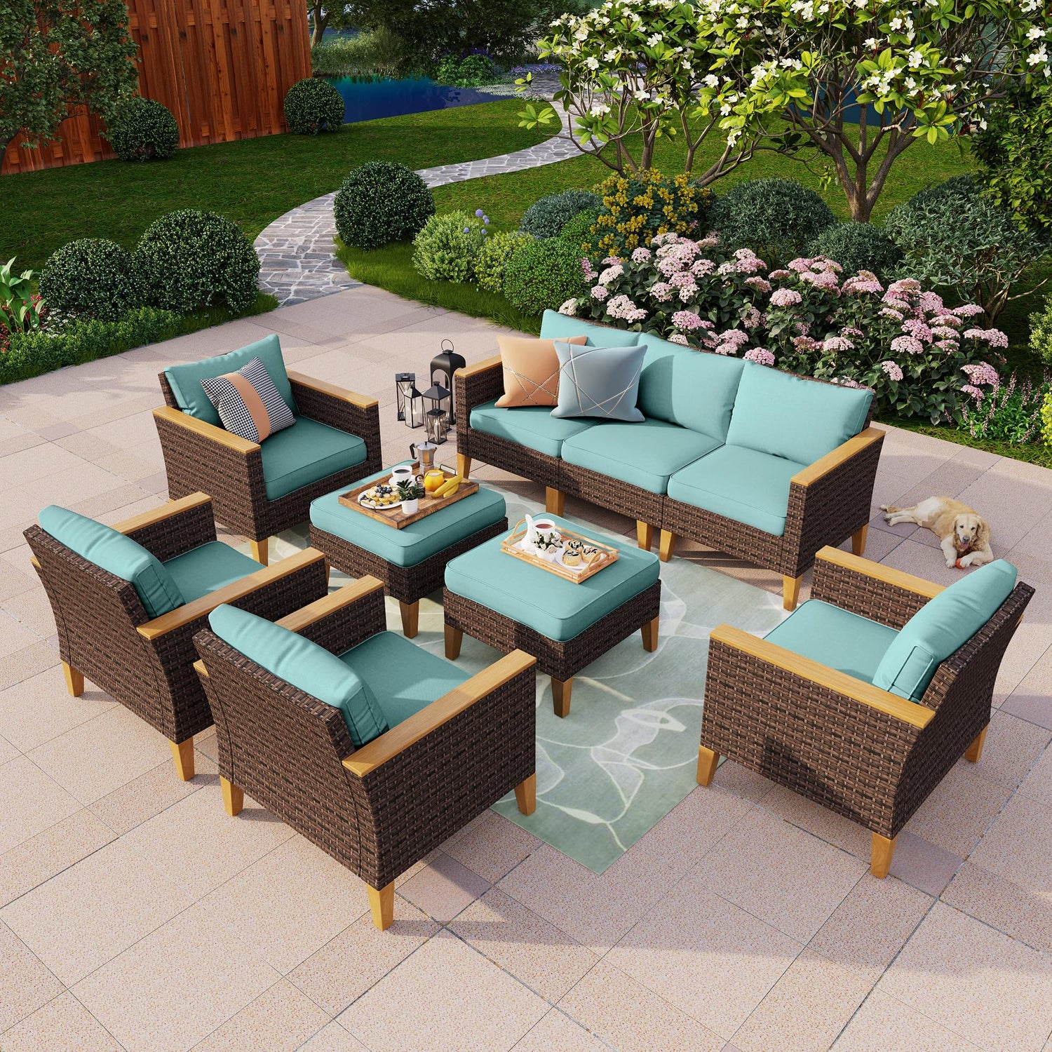 PHI VILLA 9-Piece Outdoor Sectional Porch Furniture Set, Outdoor Wicker Rattan Sofa Patio Set for 9 Seats with Cushions, Blue