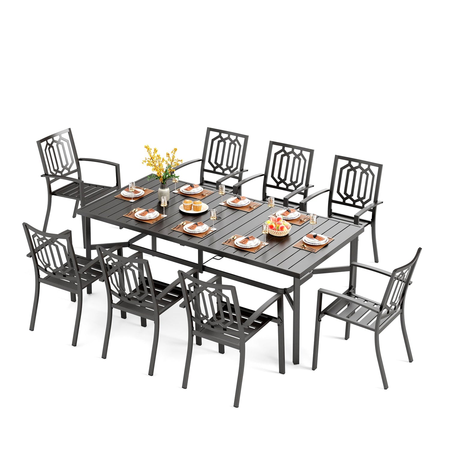 PHI VILLA 9 Pieces Outdoor Dining Set for 8, Rectangular Metal Steel Table with Umbrella Hole & Stackable Wrought Iron Chairs, Large Dining Furniture for Patio, Deck, Yard, Porch