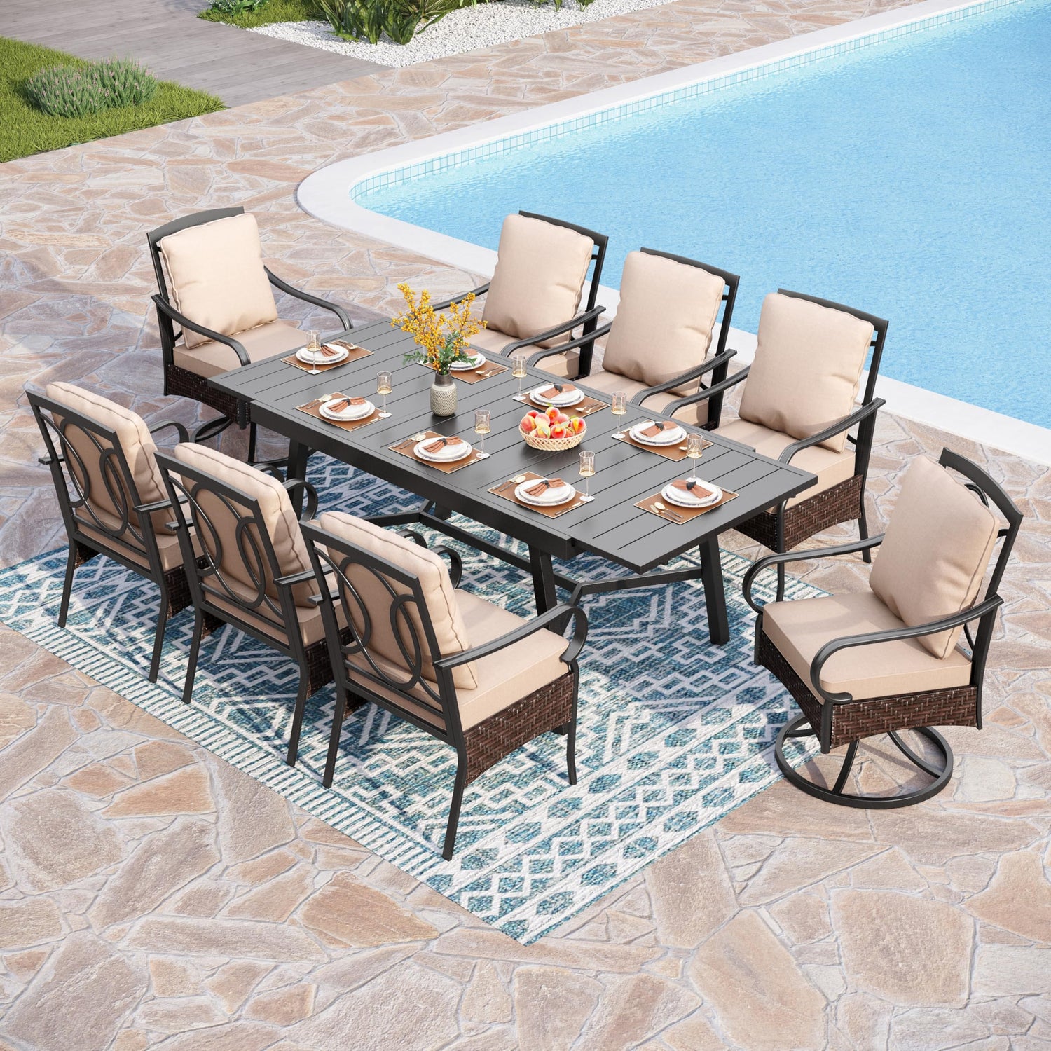 PHI VILLA Heavy Duty 9-Piece Patio Dining Sets, Expandable Outdoor Table and Chairs Set for 8, 8 Extra Large Dining Chairs(2 Swivel), Rectangular Metal Dining Table for Deck, Backyard and Garden