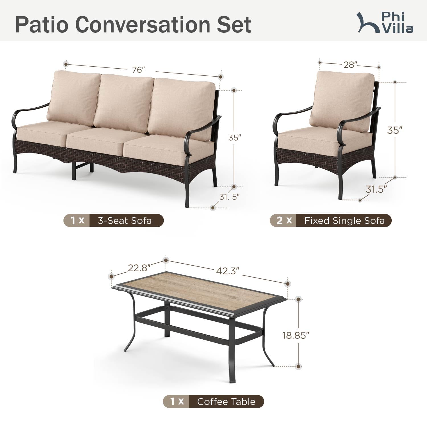 - 【Ultimate Comfortable Seating Experience】PHI VILLA 5.5" Thicker cushions have Cushion-Pro Technology, which provides better than market water, oil, stain, UV, and moisture resistance.All the cushions of this patio sofa have excellent resilience, so you don’t have to worry about sagging even with long-term use. Each cushion cover features Velcro and zippers, which help secure the cushions in place to prevent slipping, and make the covers easy to remove and wash, ensuring hassle-free cleaning