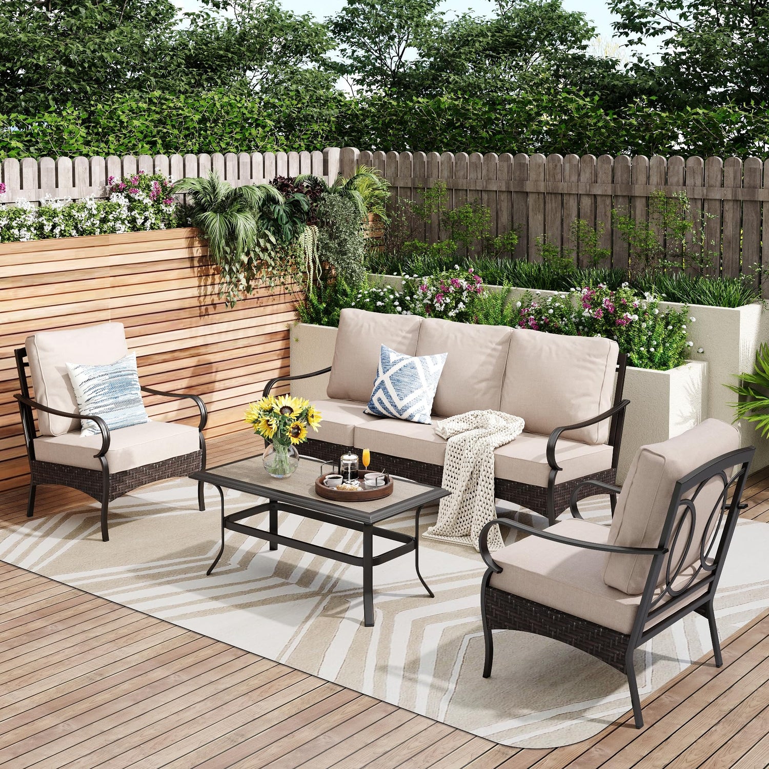 PHI VILLA Outdoor Modern Patio Furniture Set, Upgraded Wicker&Metal Patio Furniture Conversation Set with Waterproof Thick Cushions for Porch, Poolside, Deck, and Yard (4 Pieces,Beige)