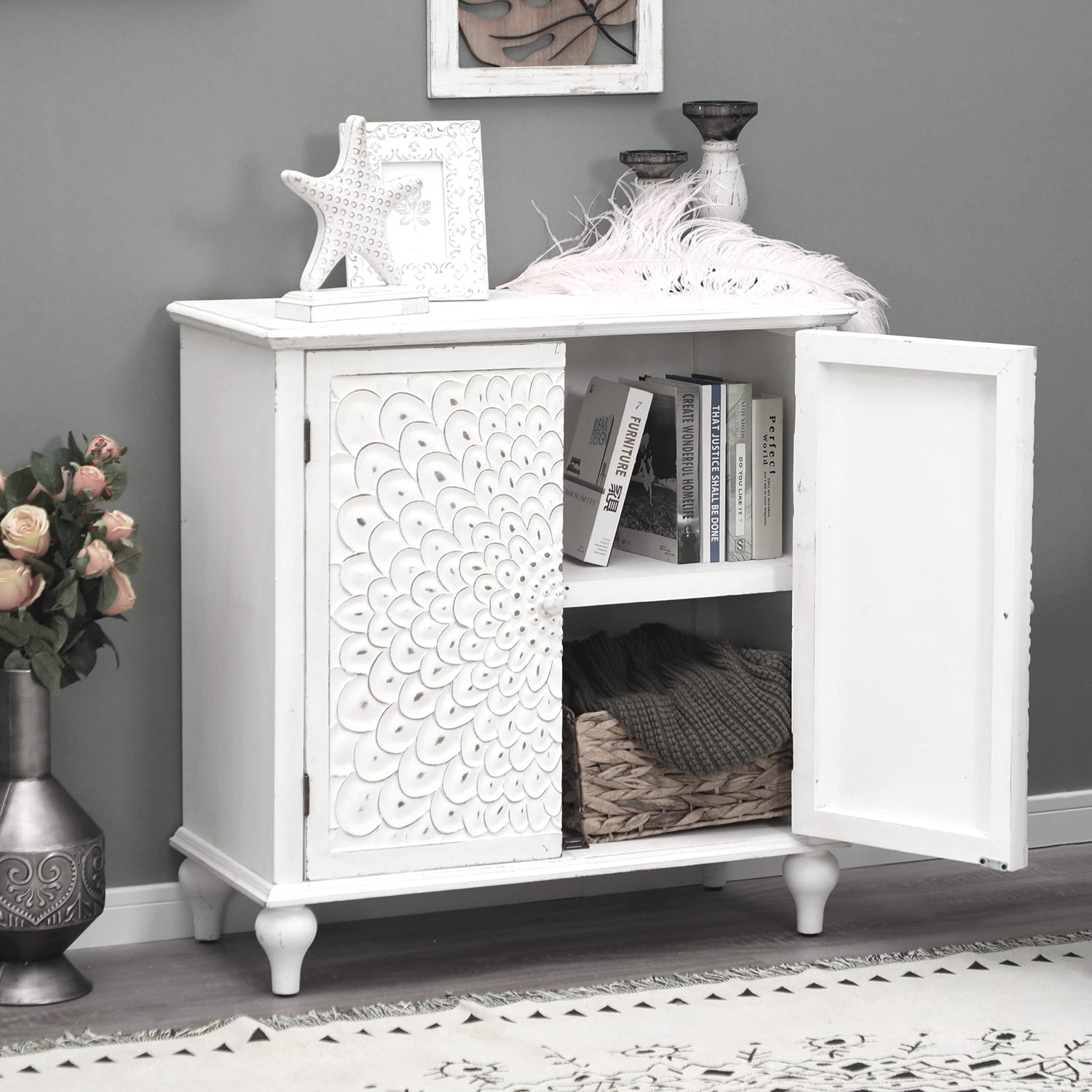 - Handmade Accent Cabinet- This vintage chic wood cabinet features with carved floral design and a hand-distressed white painted finish; It wears a hand-distressed, weathered finish that¡¯s rubbed to reveal natural wood undertones, accentuating the beauty of the dramatic door fronts