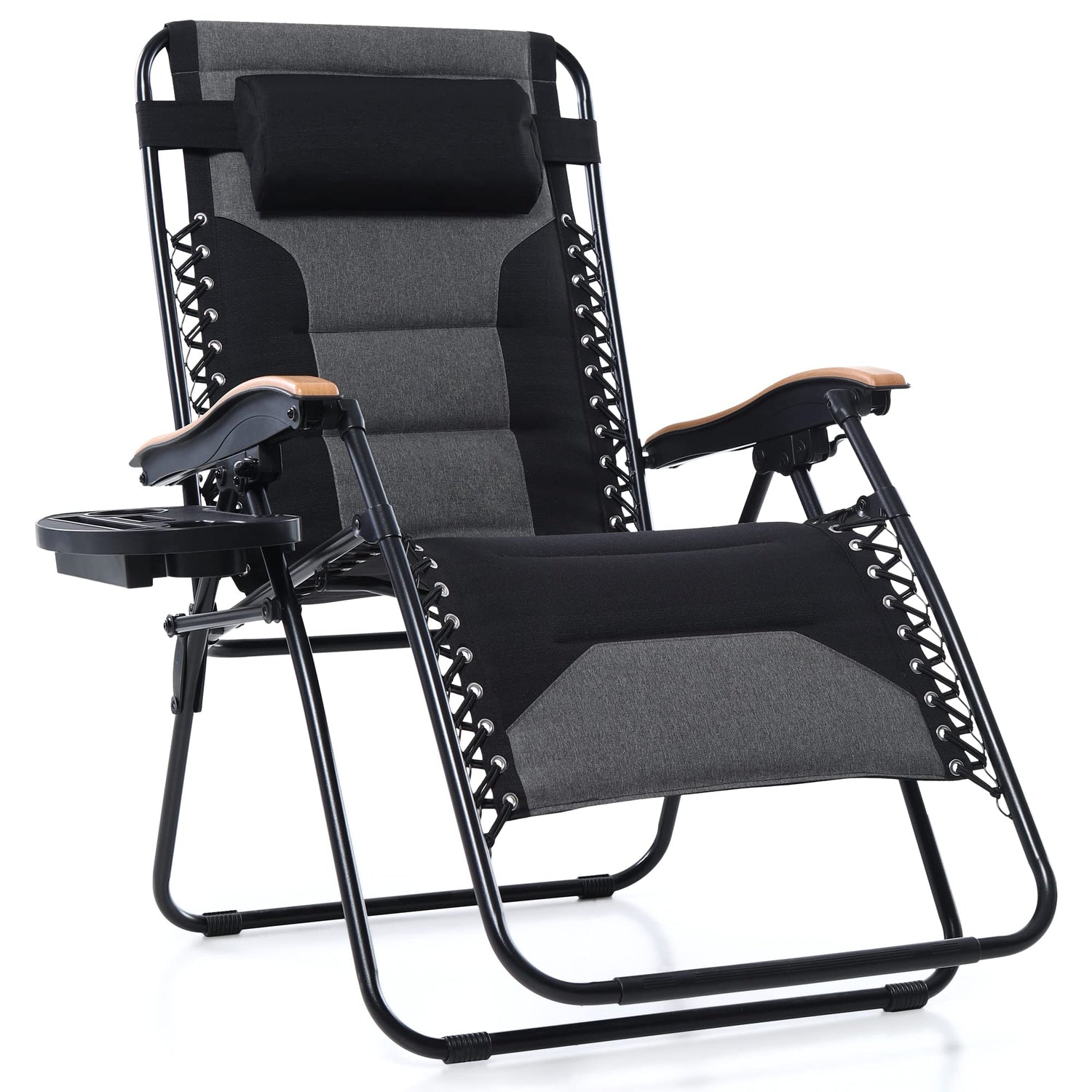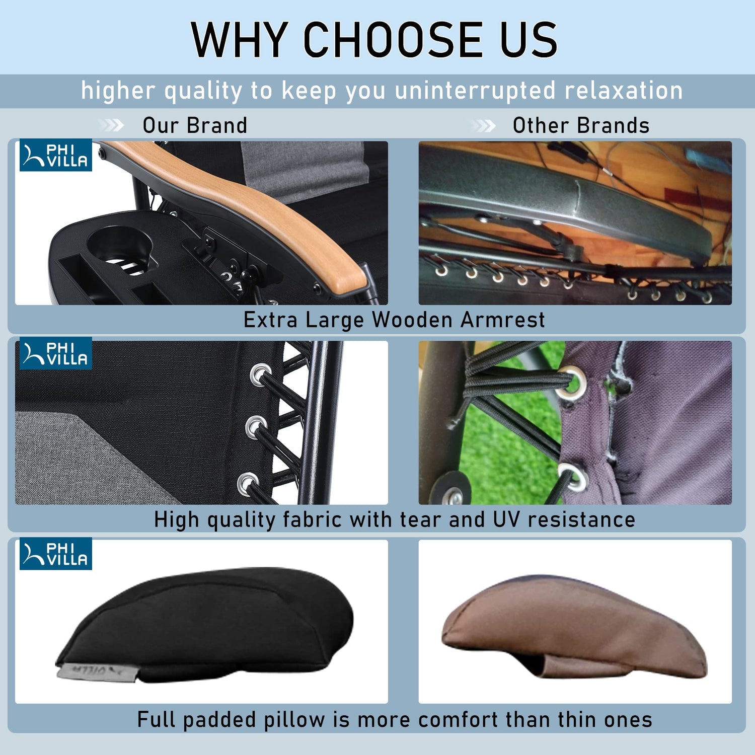 PHI VILLA XXL Oversized Padded Zero Gravity Chair, Foldable Patio Recliner, 30" Wide Seat Anti Gravity Lounger with Cup Holder, Support 400 LBS (Black)