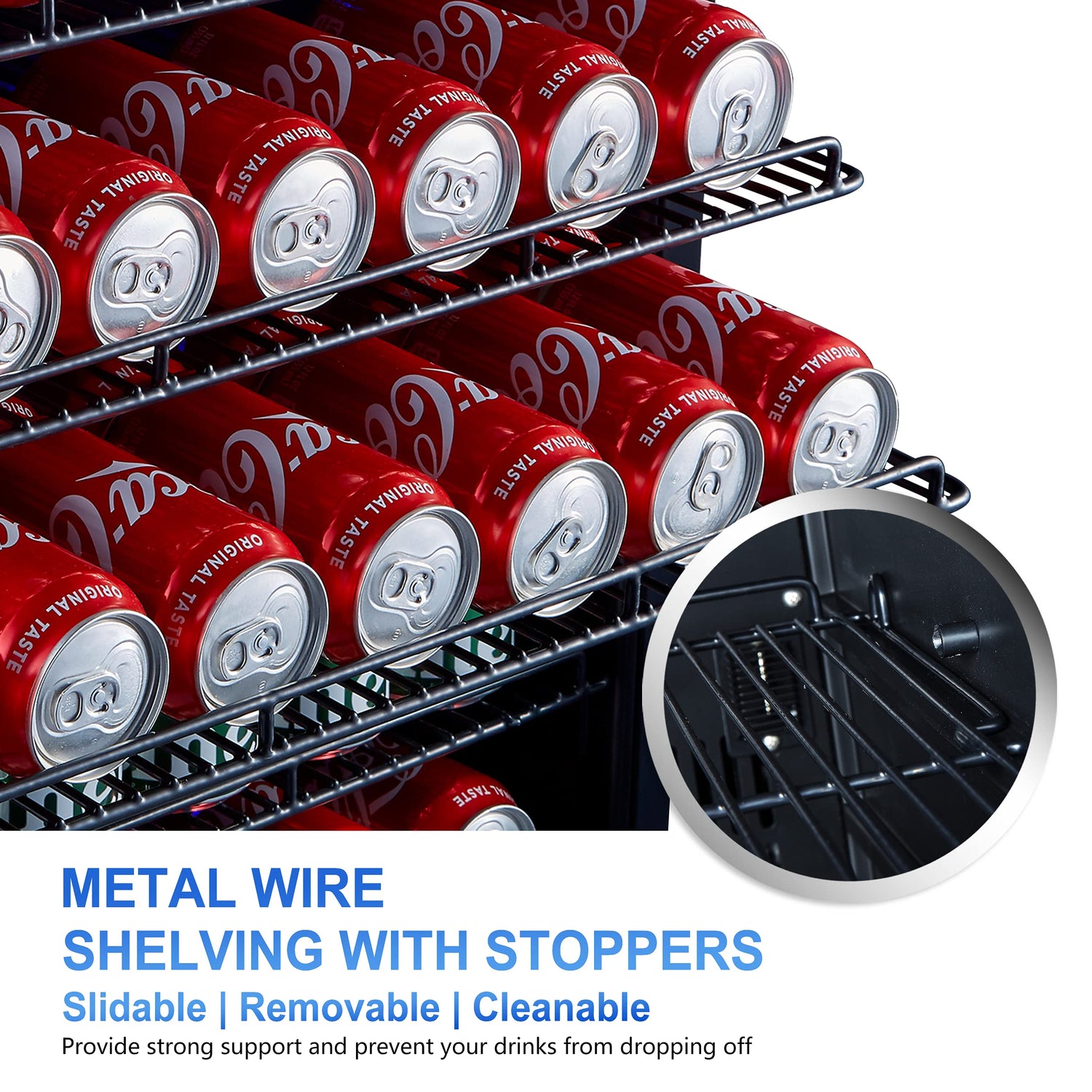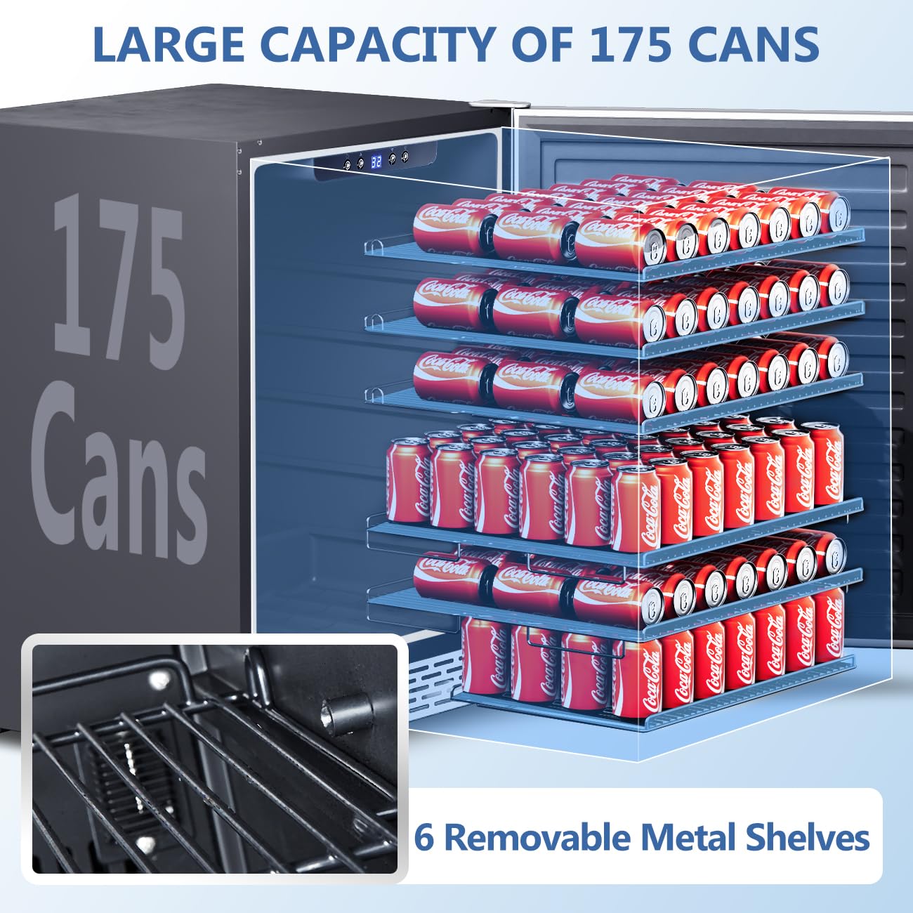 - 175 Cans LARGE CAPACITY & STAINLESS STEEL DOOR: This 24 inch Phiestina beverage refrigerator has 6 removable stainless steel shelves that allow you to store at least drinks of 175 cans (sodas,coke, beer,juice, etc.). Great for home, bars, hotels, office, kitchen counter, wine cellar. Besides,it takes up a small space of W23.4” x H33.1”x D22.4” (Internal capacity 5.3cu ft). Stainless steel door can better prevent cold air inside from leak out.