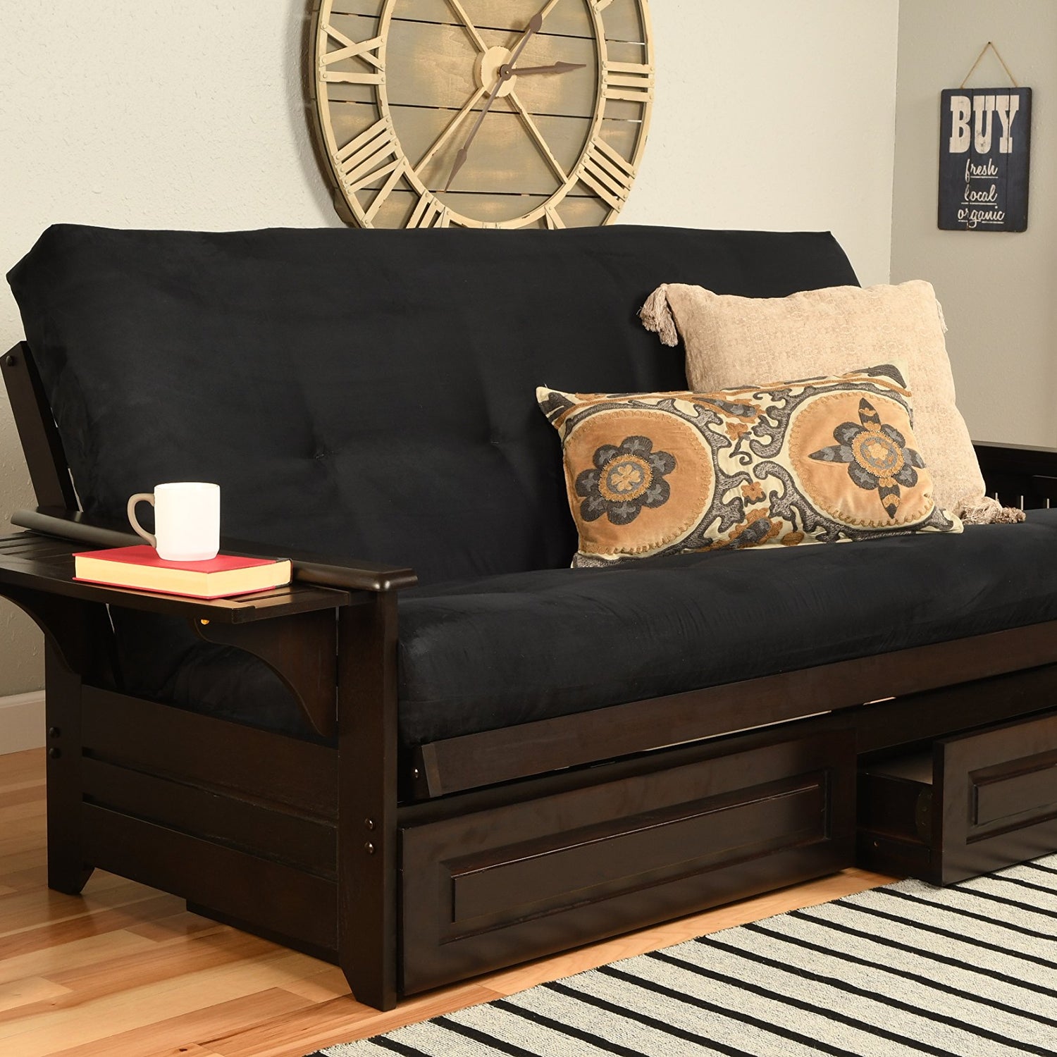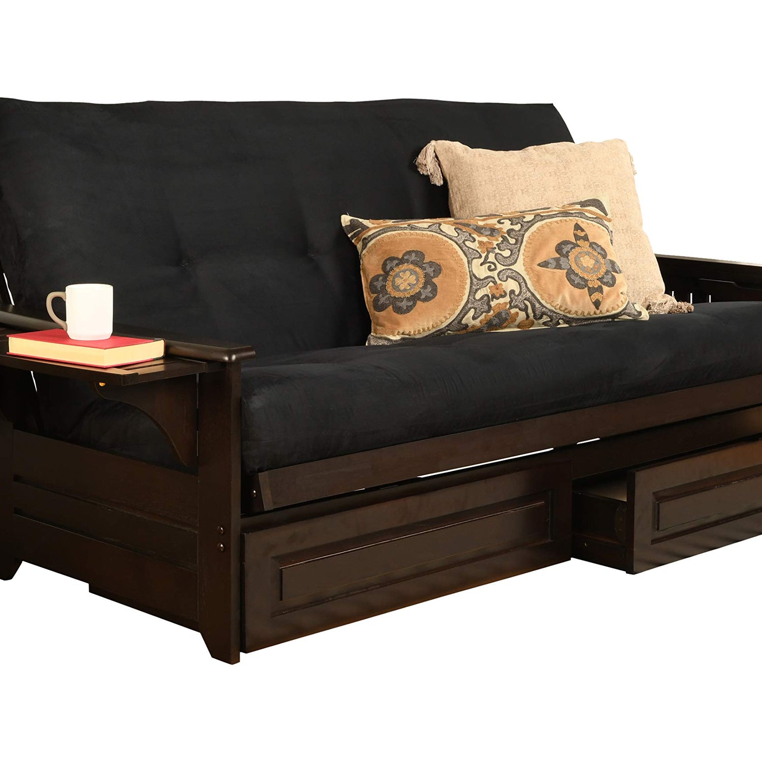 - Futon Frame and Espresso Finish with Suede Black Mattress Set: Get the full package with our futon full size. It comes as a complete futon set, including a solid wooden futon frame and a plush 100% polyester mattress for ultimate comfort.