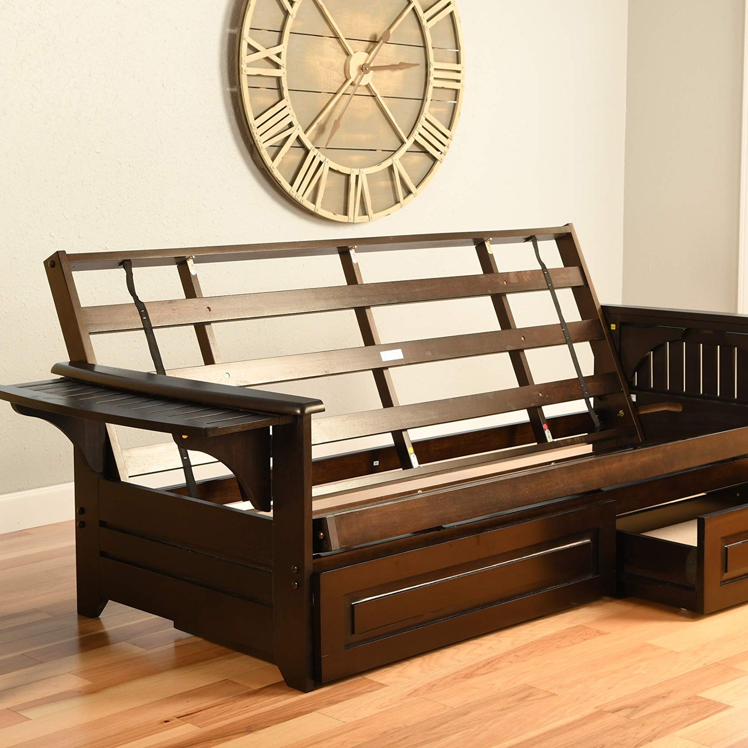 Details: The futon is a classic hardwood frame with tray style arms. This unique and versatile full size futon sofa easily converts to a bed. This multifunctional piece of furniture can find a home in just about any type of room. Mattress dimensions: 75L X 54W X 8H; Frame dimensions: 82L x 37D x 33H.